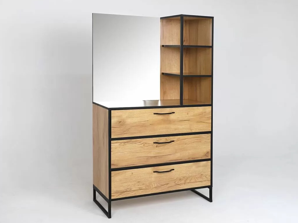 Комод состоит из 3-х выкатных ящиков, и полочек, а также имеет большое зеркало с фацетом.