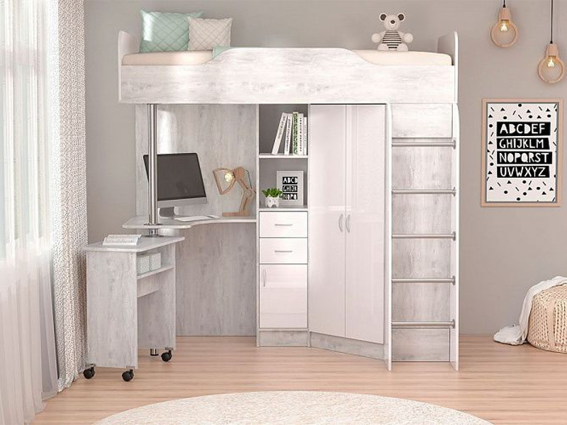 В модульную спальню входит 3 предмета мебели: кровать-чердак, шкаф и стол с выкатным модулем. Допустимая нагрузка а спальное место - до 50 кг, допустимая высота матраса - не более 120 мм.