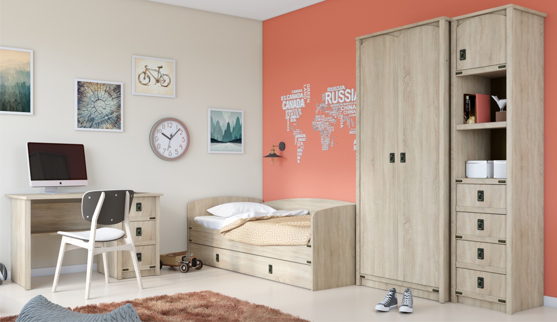 Детская модульная, комплектуется по вашему выбору. Цена за комплект на главном фото - стол с 3 ящиками, кровать с основанием, шкаф 2 дверный, пенал 1 дверь 4 ящика