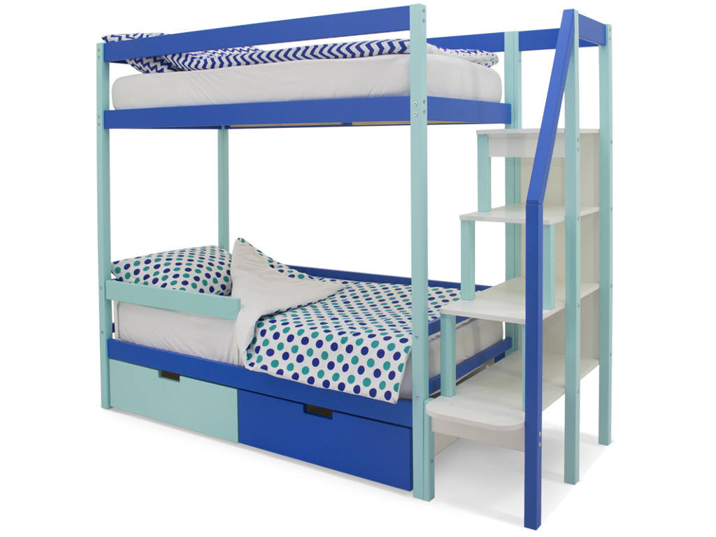 Двухъярусная кровать Svogen с ящиками и бортиком мятно-синий