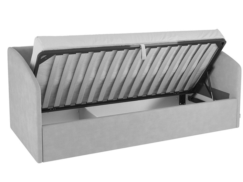 Основание подъемное входит в комплект кровати, петелька для подъема в цвет ткани на корпусе. Кровать имеет огромный ящик для хранения.