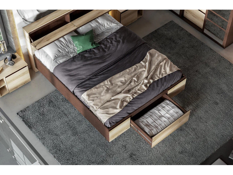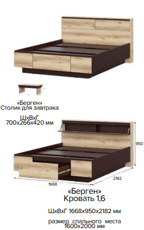 - Кровать двойная (1,6х2,0) ( 131,9 кг; 0,261 м3) ( 1668х950х2182, столик 700х266х420 мм)