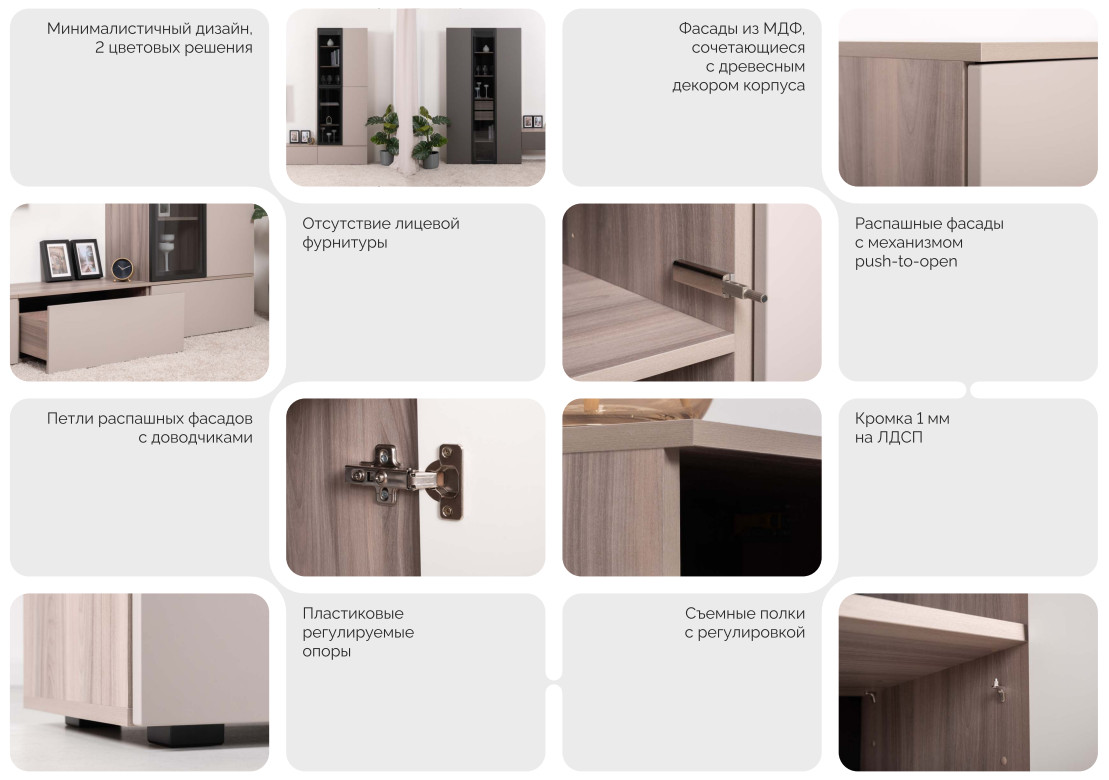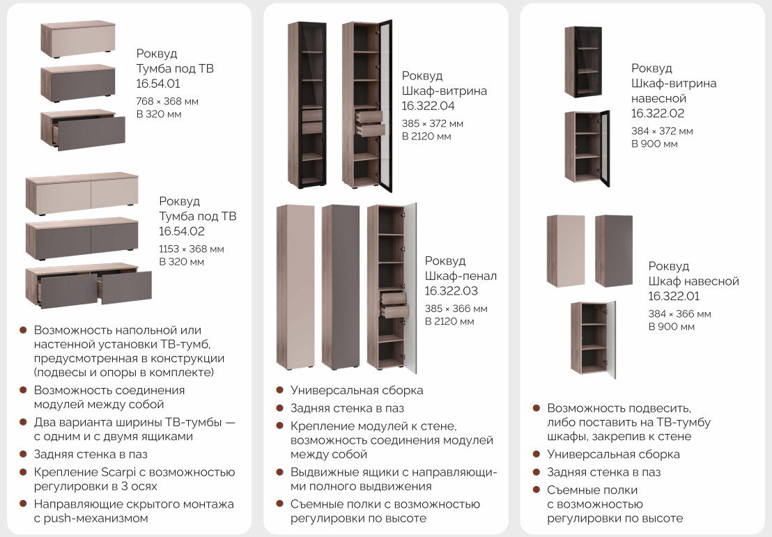 Цена за комплект: Тумба под ТВ 16.54.01, Тумба под ТВ 16.54.02, Шкаф-витрина 16.322.04,Шкаф-пенал 16.322.03 (2 шт)
