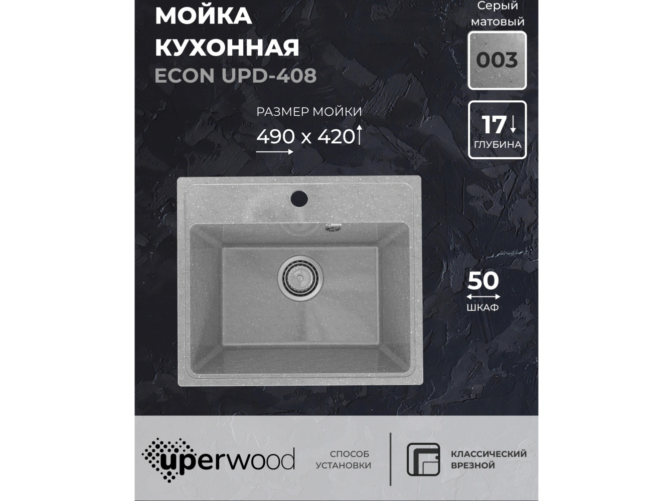 - Кухонная мойка Uperwood ECON UPD-408-003 серая матовая