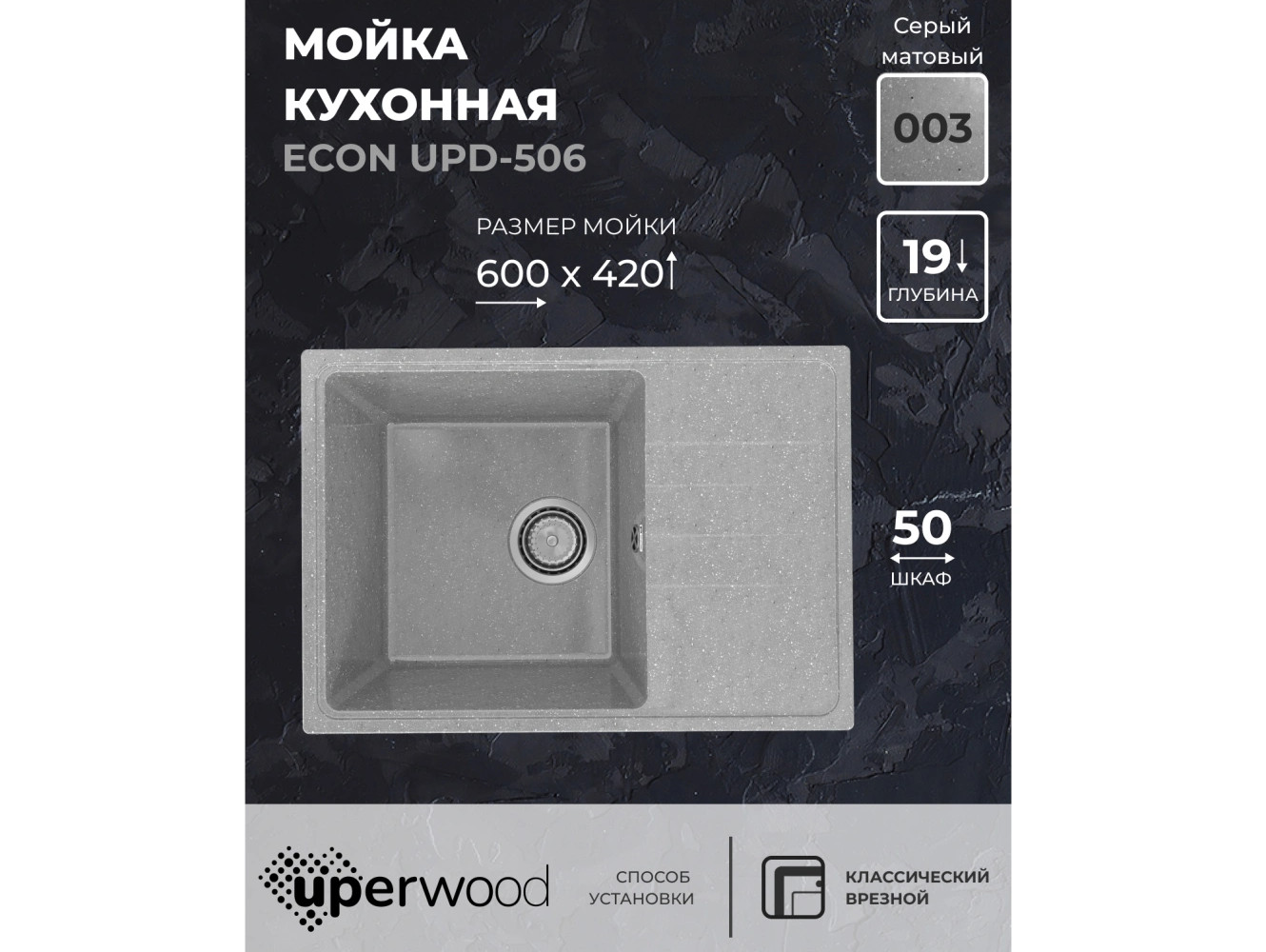 - Кухонная мойка Uperwood ECON UPD-506-003 серая матовая