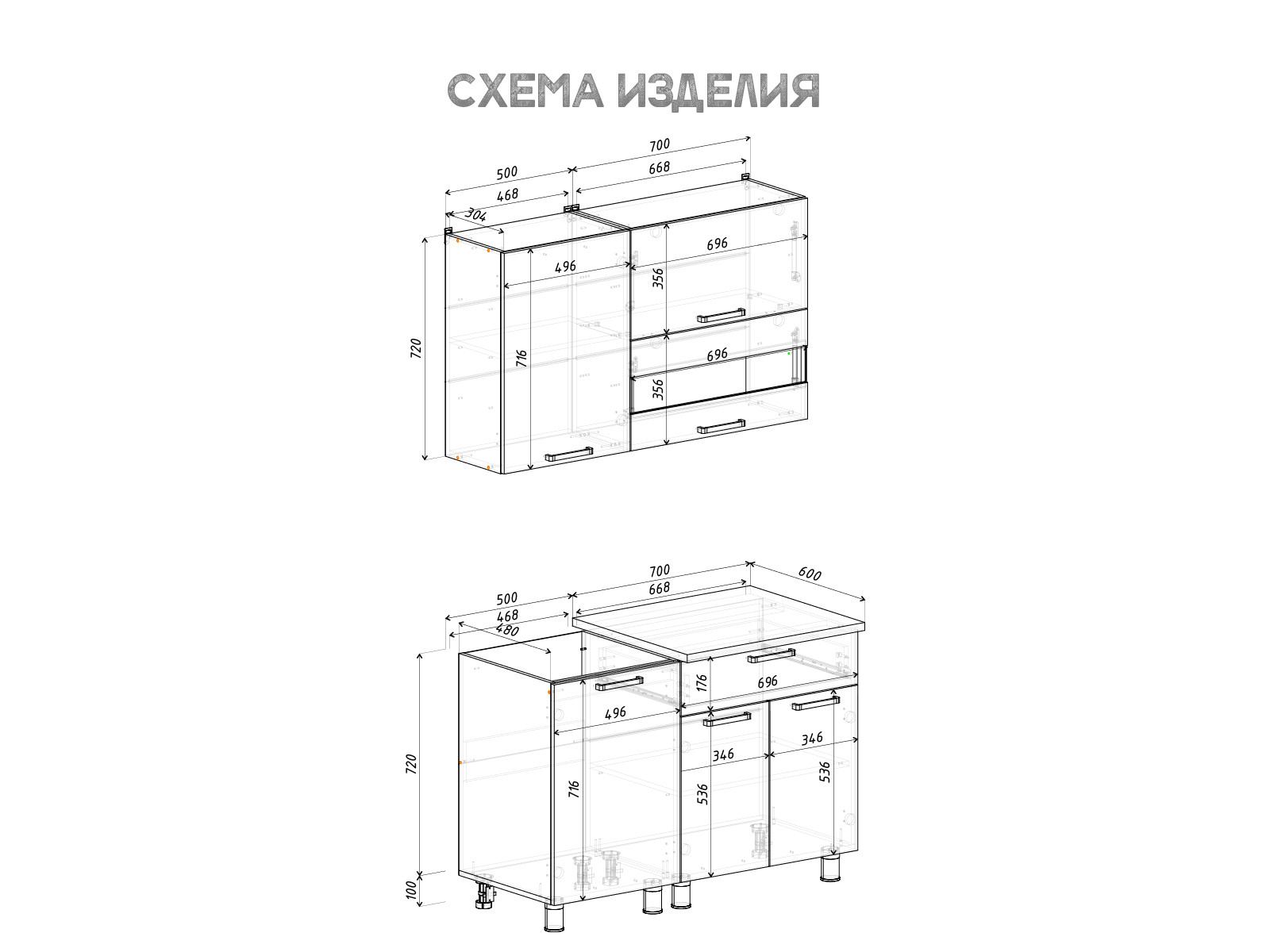 Габаритные размеры композиции нижних модулей с учётом столешницы: ширина - 1200 мм, высота - 846 мм, глубина - 595 мм.