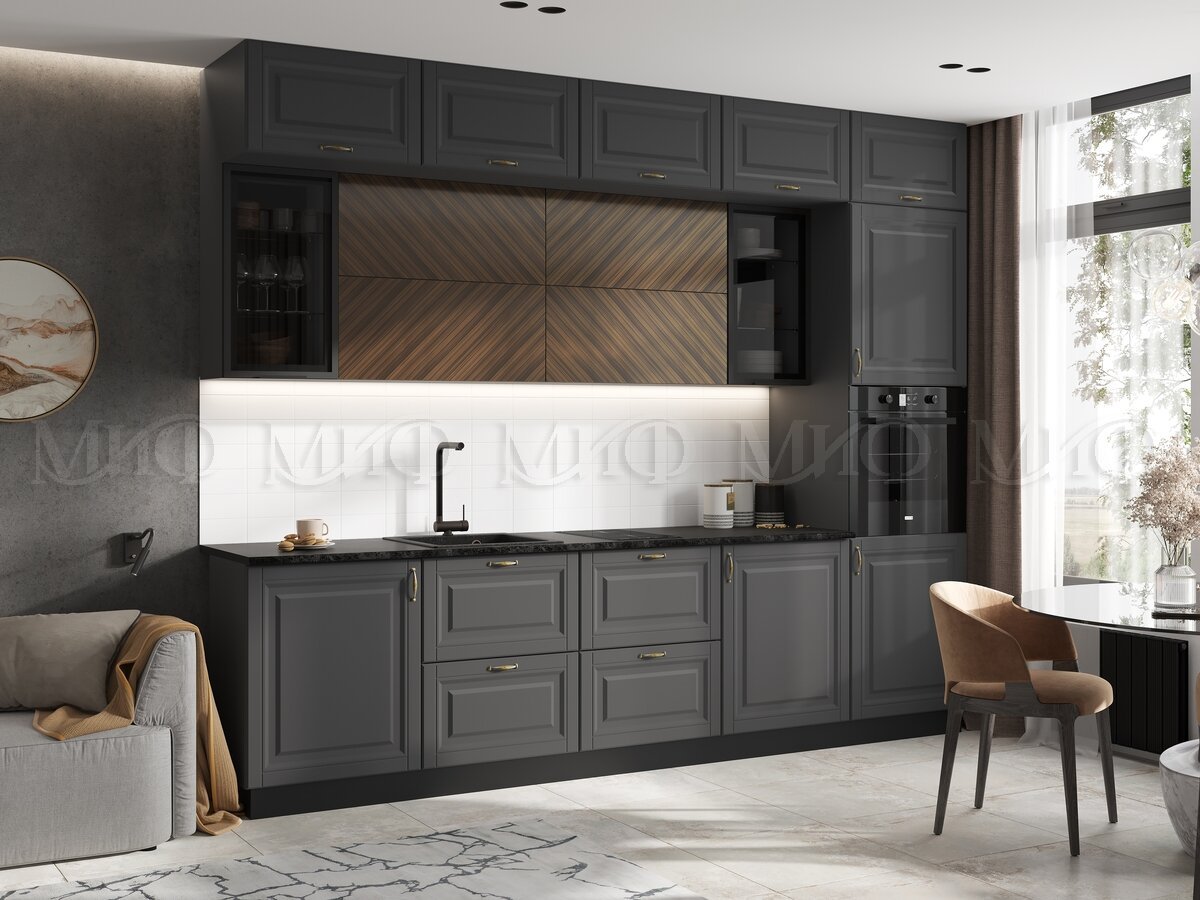 - Кухня Престиж 3000 мм Компоновка №2 Графит софт/Прайм орех