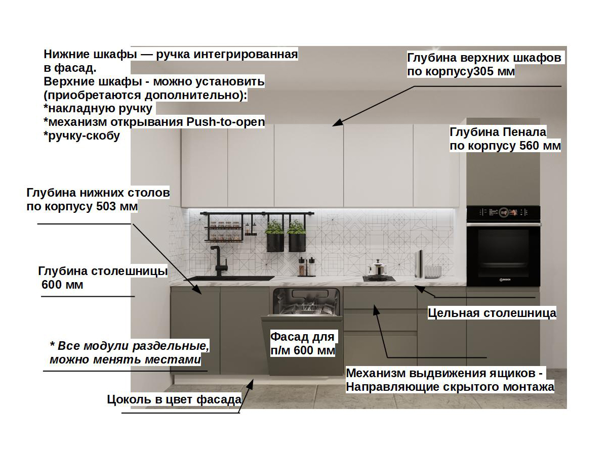 Кухонная мойка, стеновая панель, посудосушитель, планки для столешницы в комплект не входят.