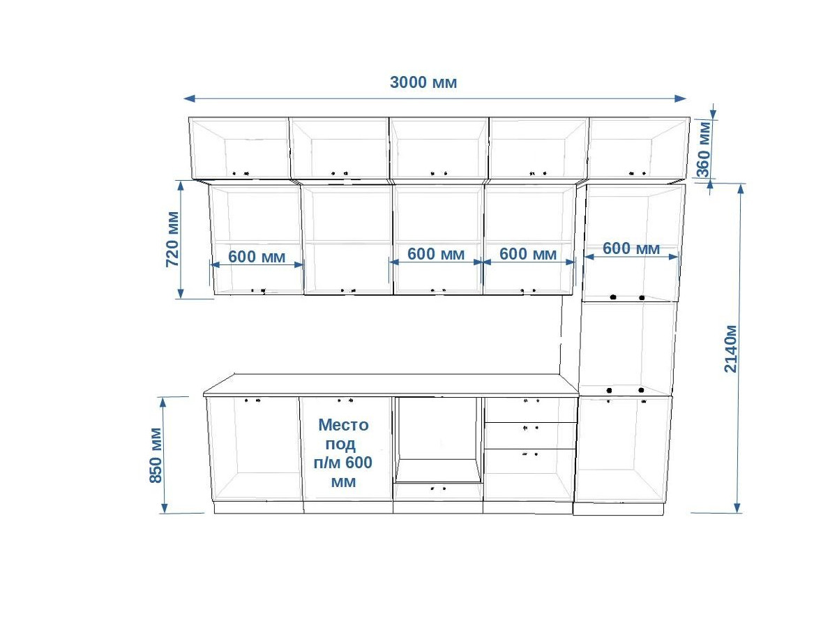 Кухонная мойка, стеновая панель, посудосушитель, планки для столешницы в комплект не входят.