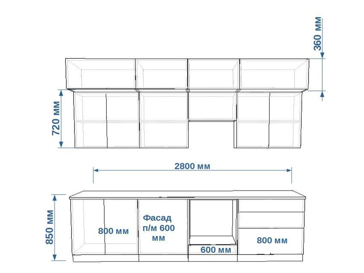 Кухонная мойка, стеновая панель, посудосушитель, планки для столешницы в комплект не входят.