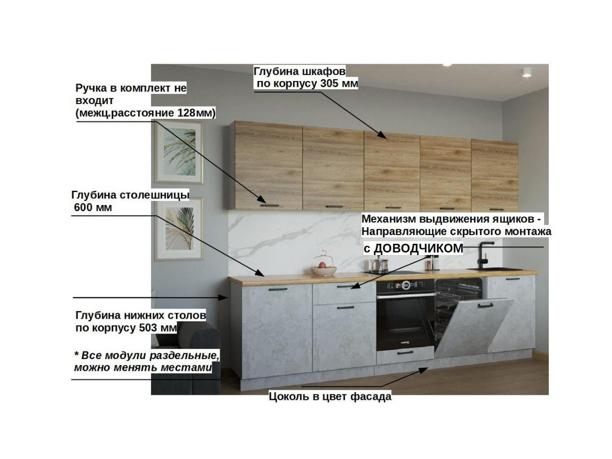 Кухонная мойка, стеновая панель, посудосушитель, планки для столешницы в комплект не входят.