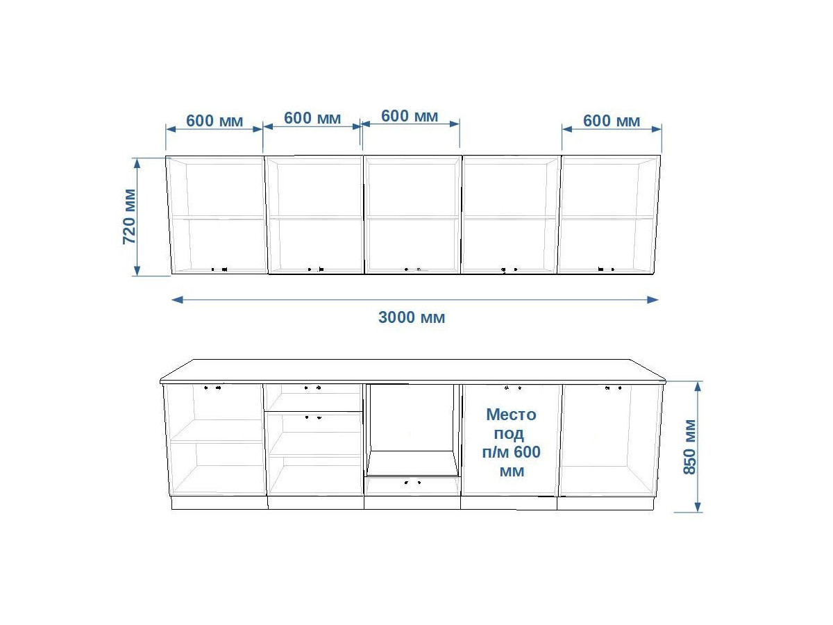- высота верхних шкафов 720 мм