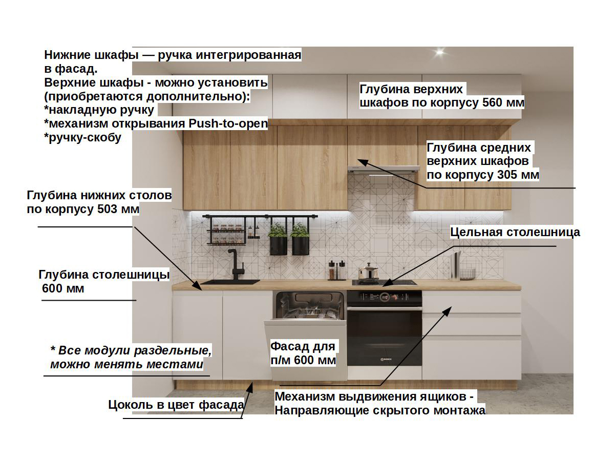 Кухонная мойка, стеновая панель, посудосушитель, планки для столешницы в комплект не входят.