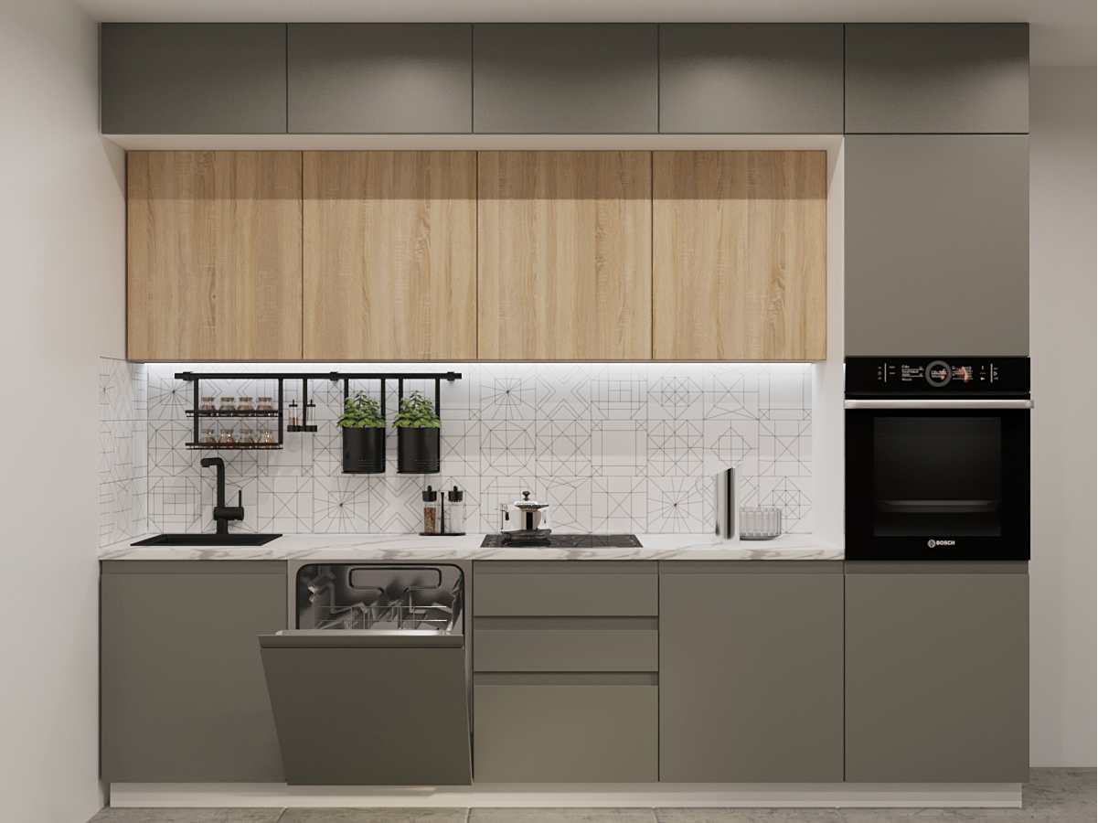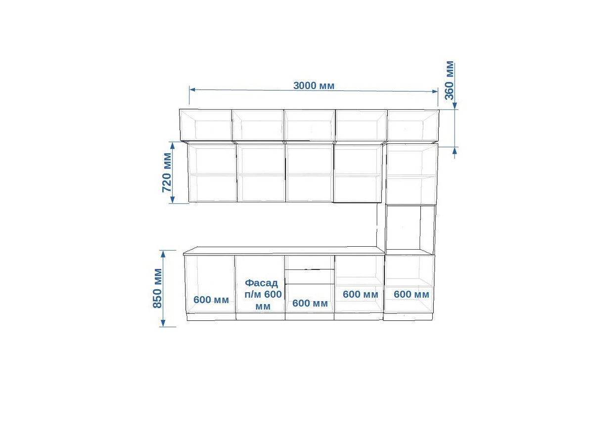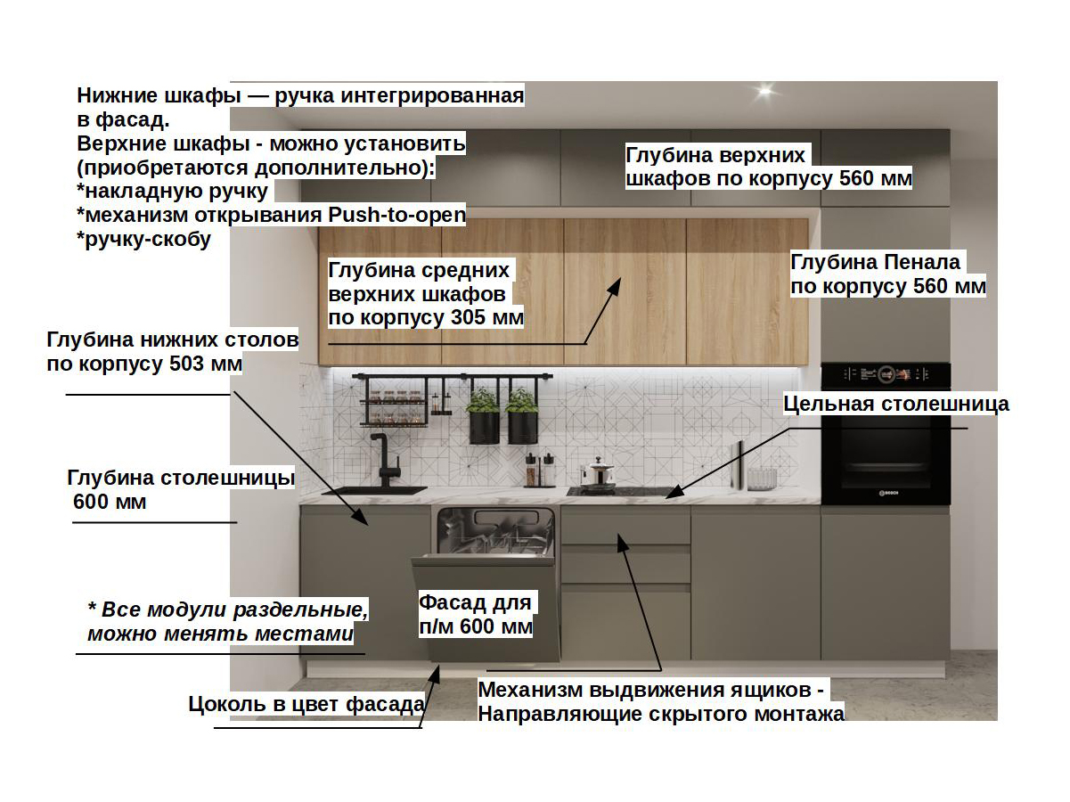 Кухонная мойка, стеновая панель, посудосушитель, планки для столешницы в комплект не входят.