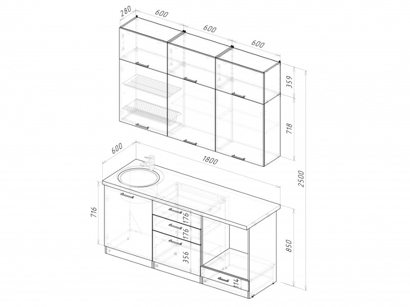 Мойка, смеситель, стеновая панель и посудосушитель в комплект гарнитура не входят.