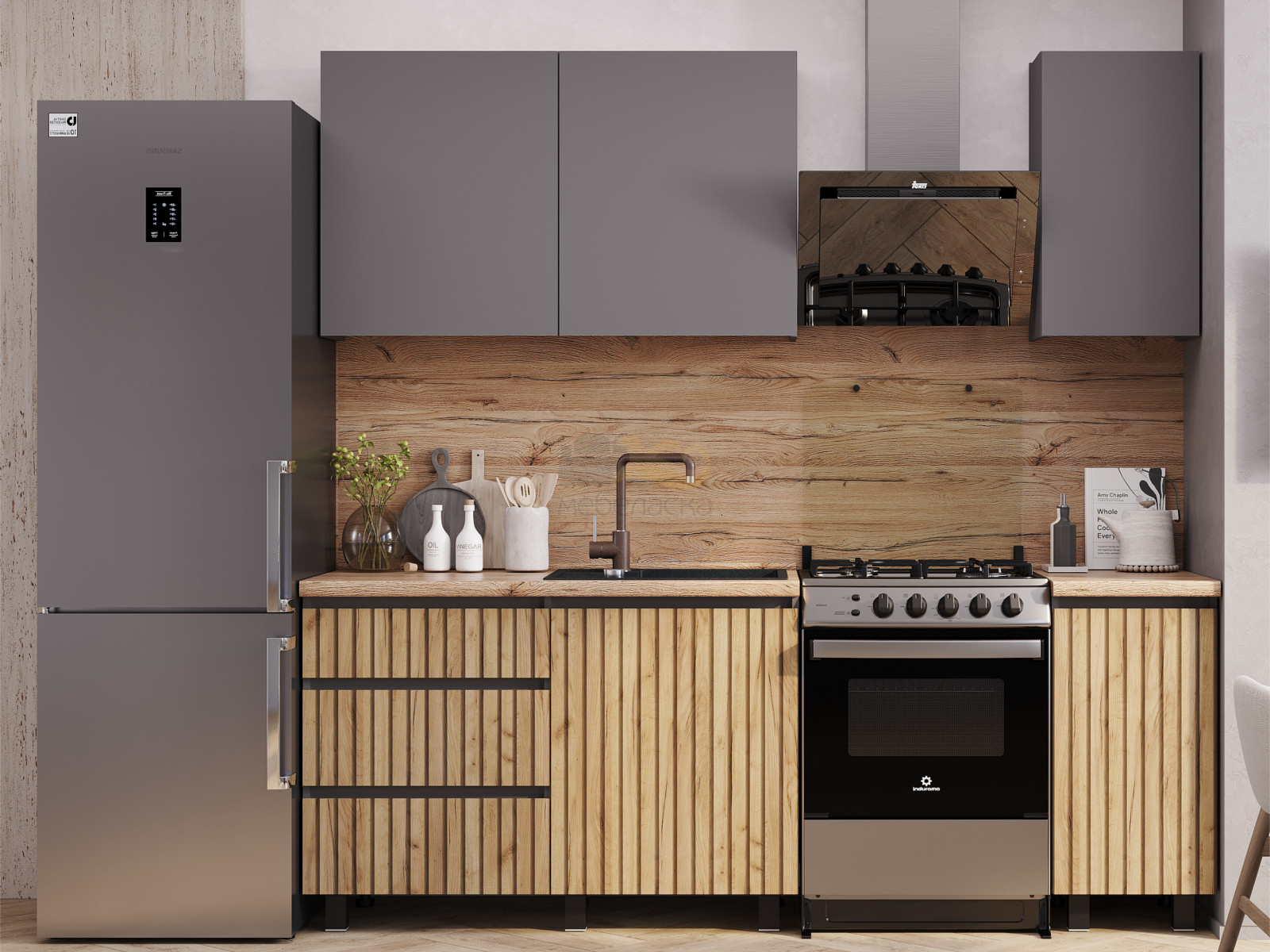 Универсальный дизайн кухни "Шерлок" легко адаптируется под различные интерьерные решения. Фотопечать "рейки" создает иллюзию фактурности. Высокие ножки позволяют без труда поддерживать чистоту на кухне с помощью робота-пылесоса.