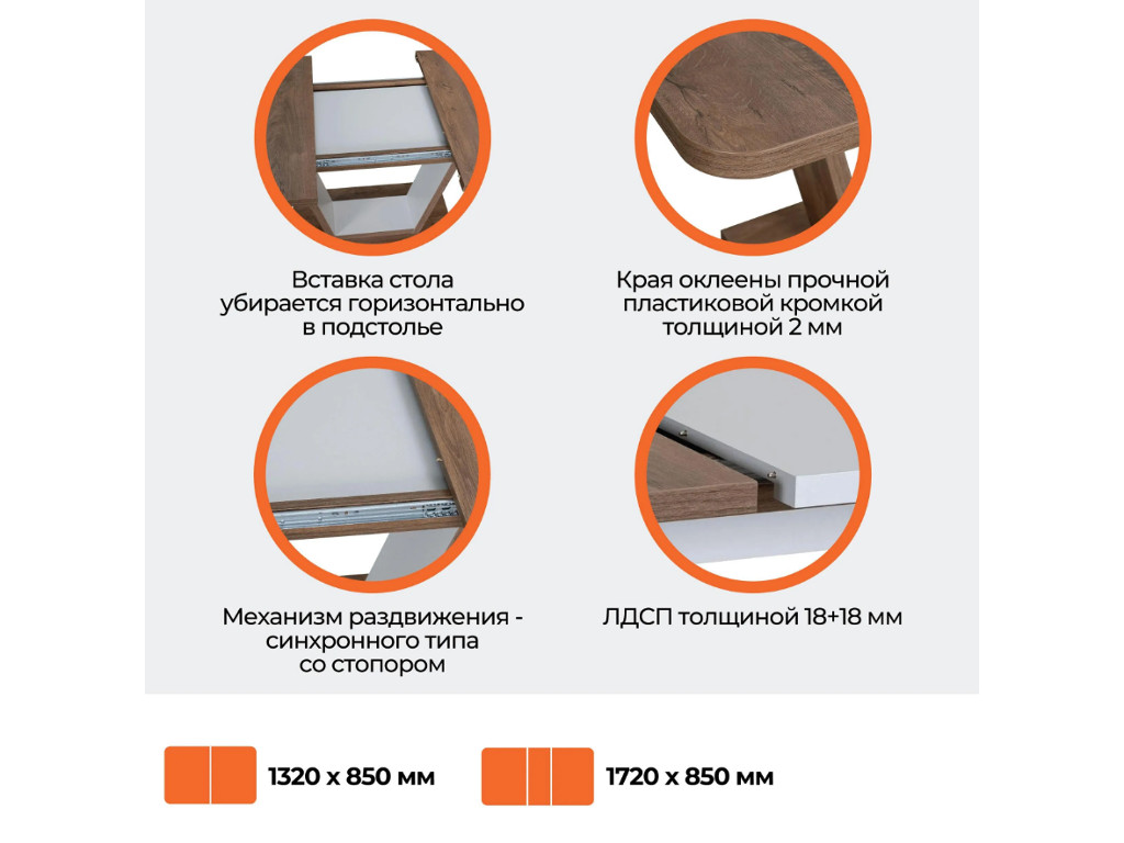 Размеры стола дают возможность с комфортом разместить от четырех до восьми человек. Вставка стола убирается горизонтально в подстолье. Края оклеены прочной пластиковой кромкой толщиной 2 мм. ЛДСП толщиной 18+18 мм. Механизм раздвижения - синхронного типа со стопором.