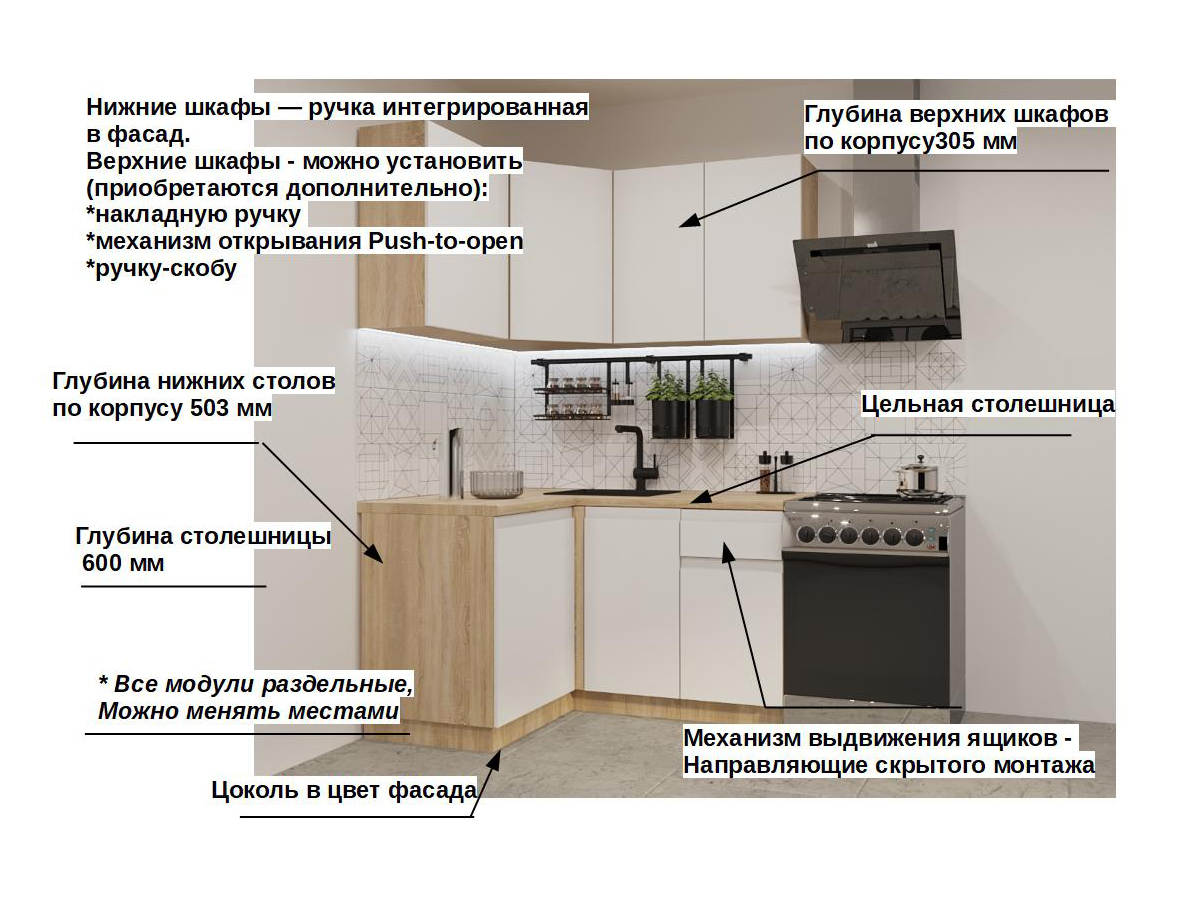 Кухонная мойка, стеновая панель, посудосушитель, планки для столешницы в комплект не входят.