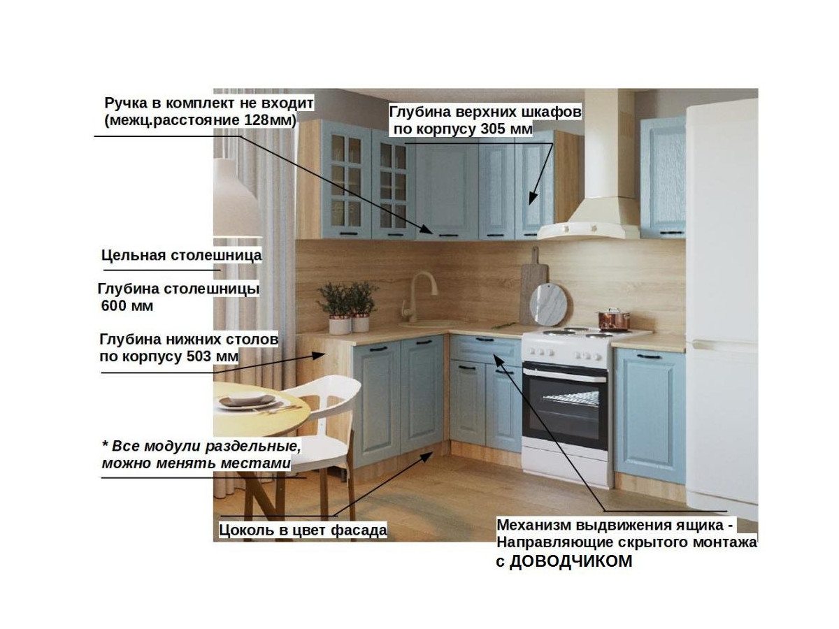 Кухонная мойка, стеновая панель, посудосушитель, планки для столешницы в комплект не входят.