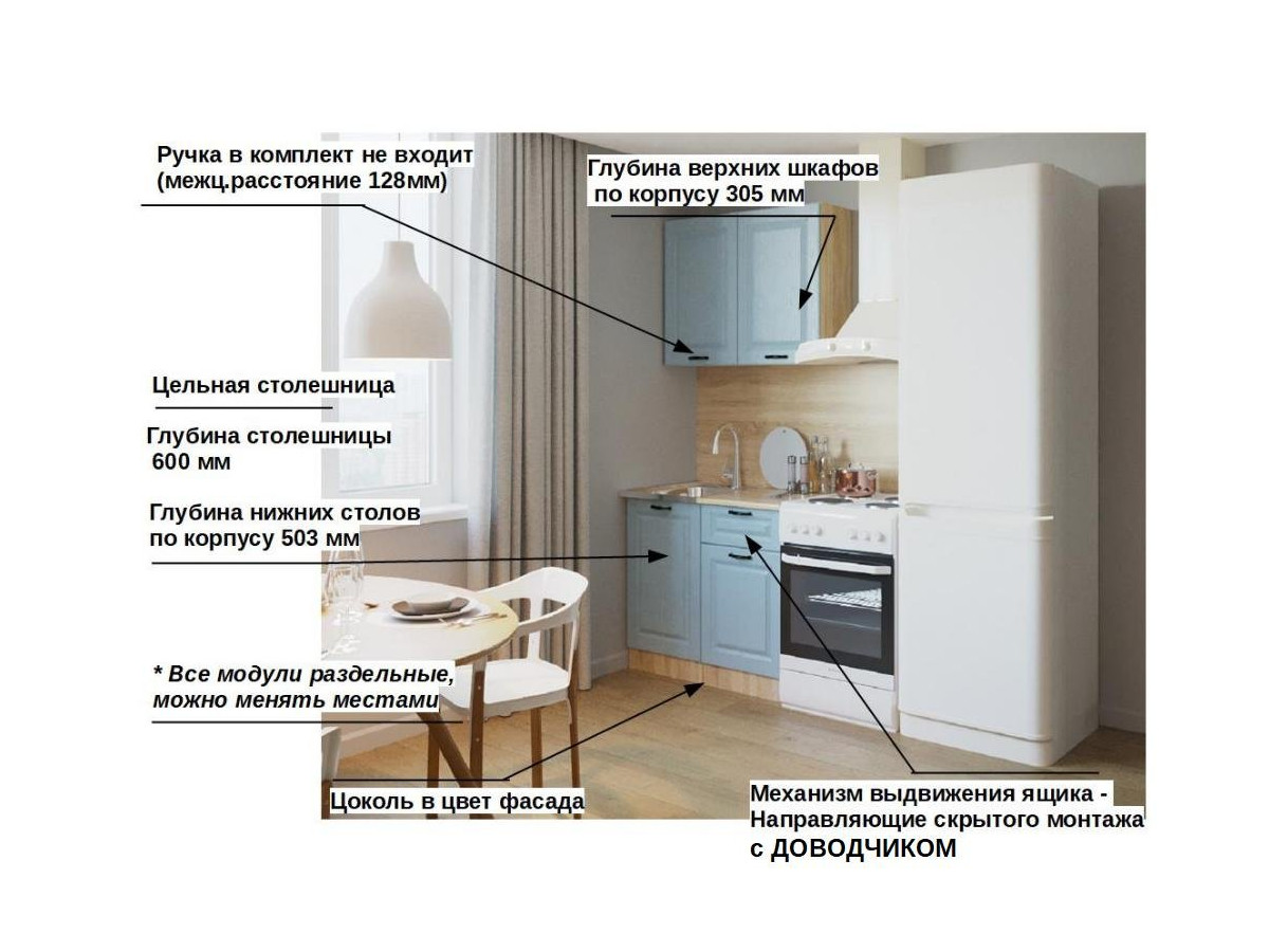 Кухонная мойка, стеновая панель, посудосушитель, планки для столешницы в комплект не входят.