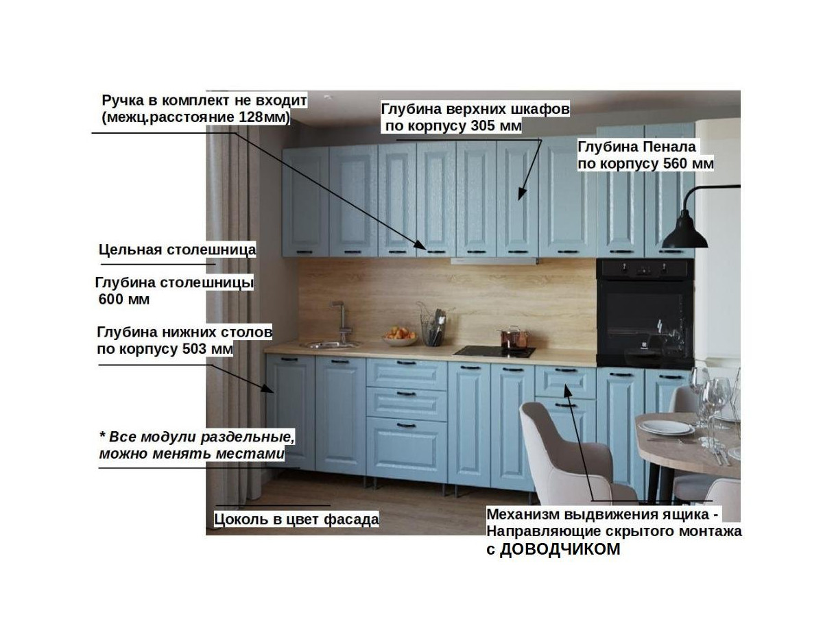 Кухонная мойка, стеновая панель, посудосушитель, планки для столешницы в комплект не входят.