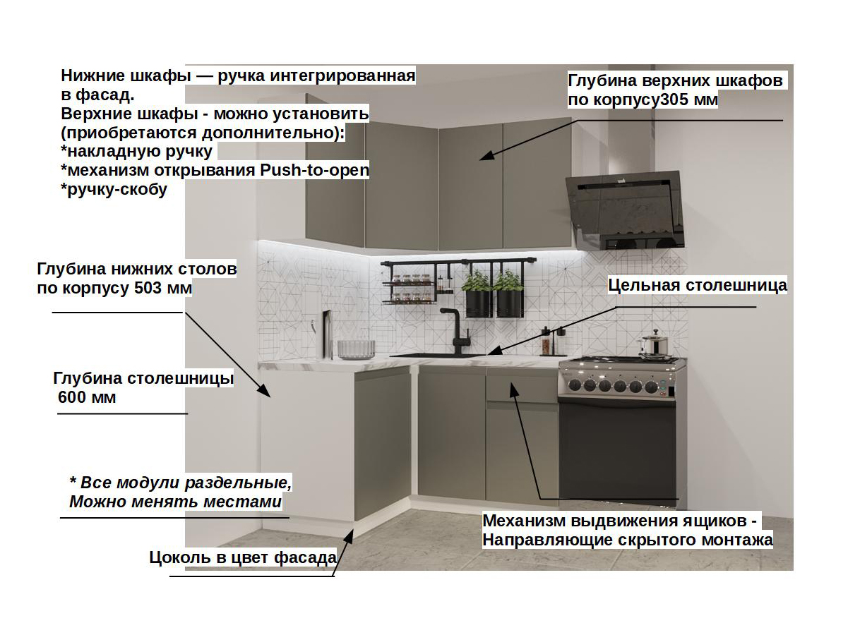 Кухонная мойка, стеновая панель, посудосушитель, планки для столешницы в комплект не входят.