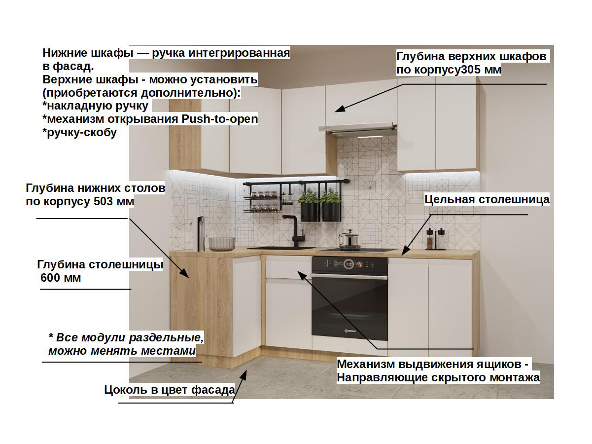 Кухонная мойка, стеновая панель, посудосушитель, планки для столешницы в комплект не входят.
