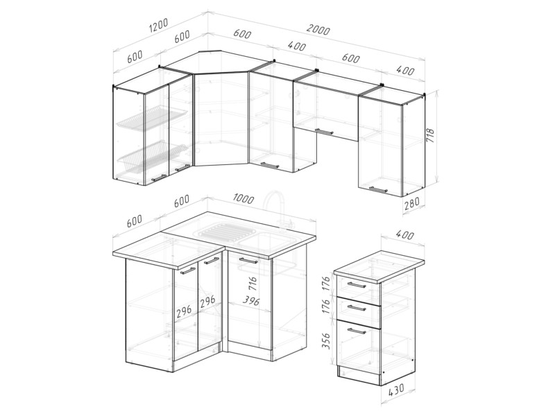 Мойка, смеситель, стеновая панель и посудосушитель в комплект гарнитура не входят.