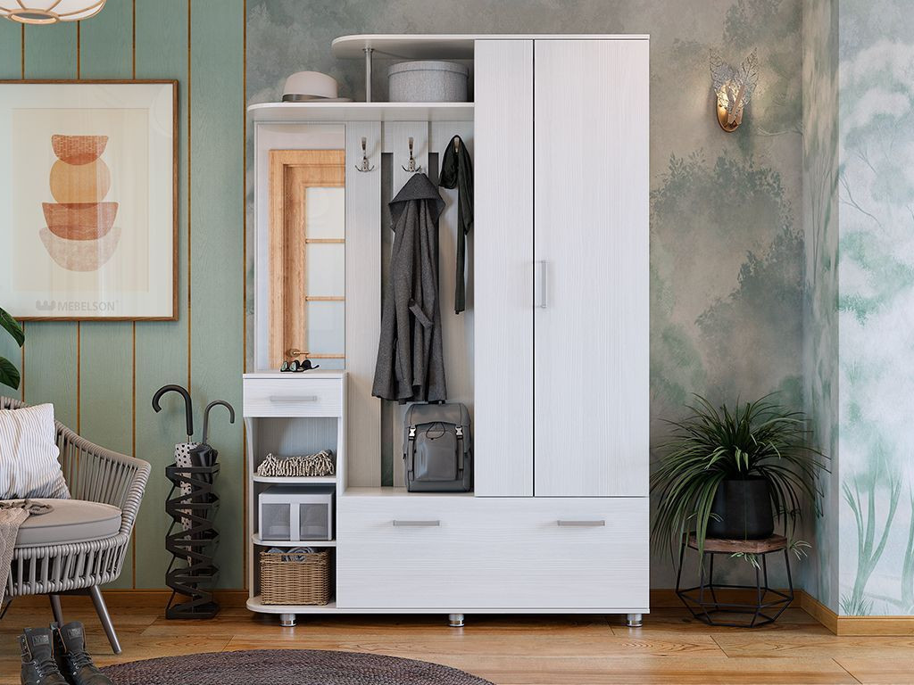 Состоит из: шкафа с выдвижной штангой, вешалки с крючками для одежды и сумок, обувницы, открытых полок, зеркала, полки для головных уборов, выдвижного ящика. Сборка универсальная, рисунок на фасадах не универсальный.