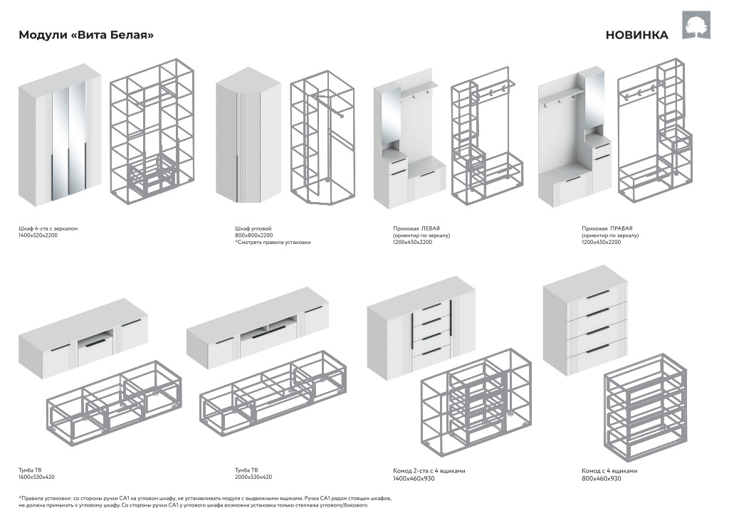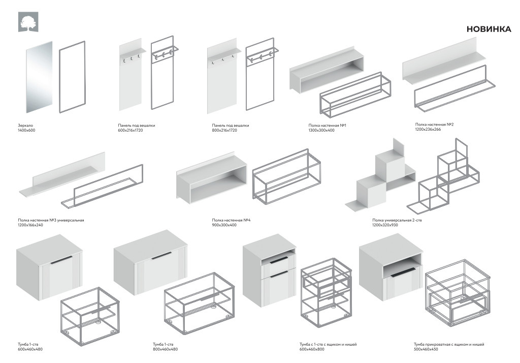 Цена за комплект: Комод с 4 ящиками, Шкаф 2-створчатый для одежды, Панель под вешалки 800, Тумба 1-створка 800, Зеркало , Тумба 1-створка с ящиком и нишей