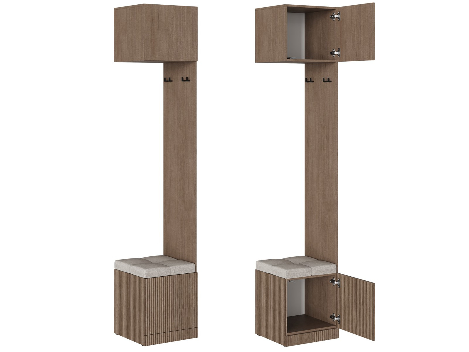 Третья часть расположена внизу стеллажа. Габарит отсека Д.418 х В.368 х Г.426 мм. Видимая боковина и створка из ЛДСП в цвет фасада. Фасад открывается при помощи отталкивателя. Задняя стенка ЛХДФ. Сверху располагается мягкая сидушка, габарит Д.435 х В.56 х Г.448мм.