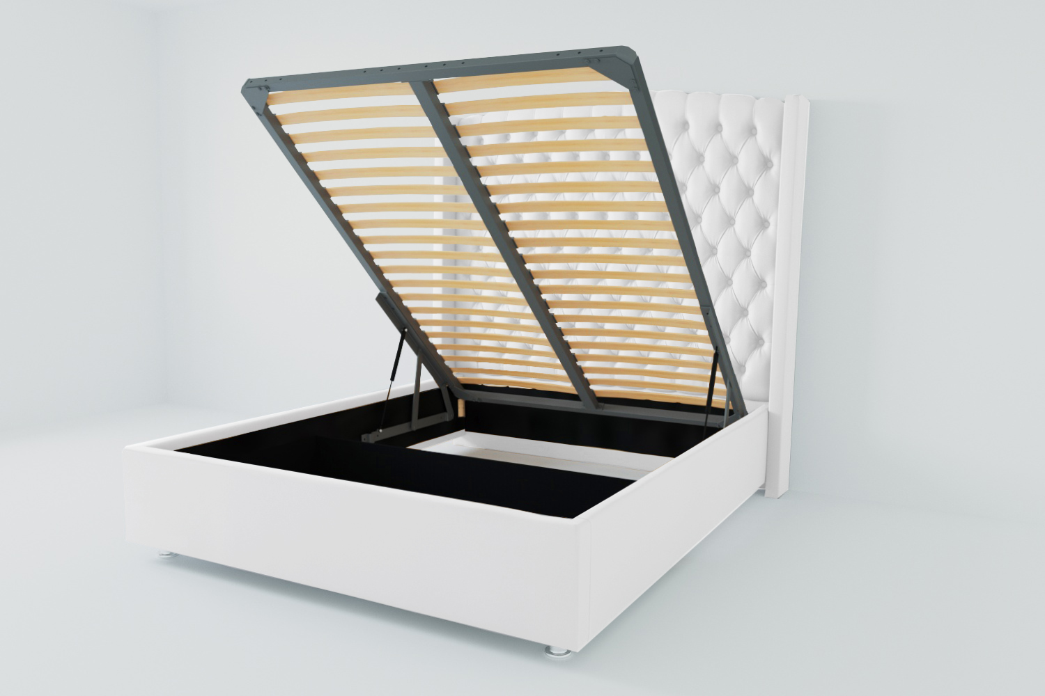 Короб для белья установлен в нижней половине кровати, ее верхнюю половину занимает подъемный механизм.