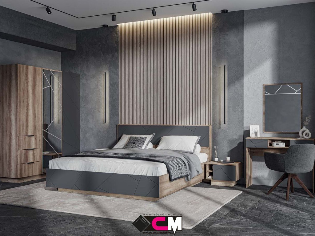 Цена за комплект на фото: КР 01 Кровать 1,6х2,0, З 01 Зеркало, ТБ 01 Тумба прикроватная, СТ 02 Стол макияжный, ШК 01 Шкаф 3х-створчатый