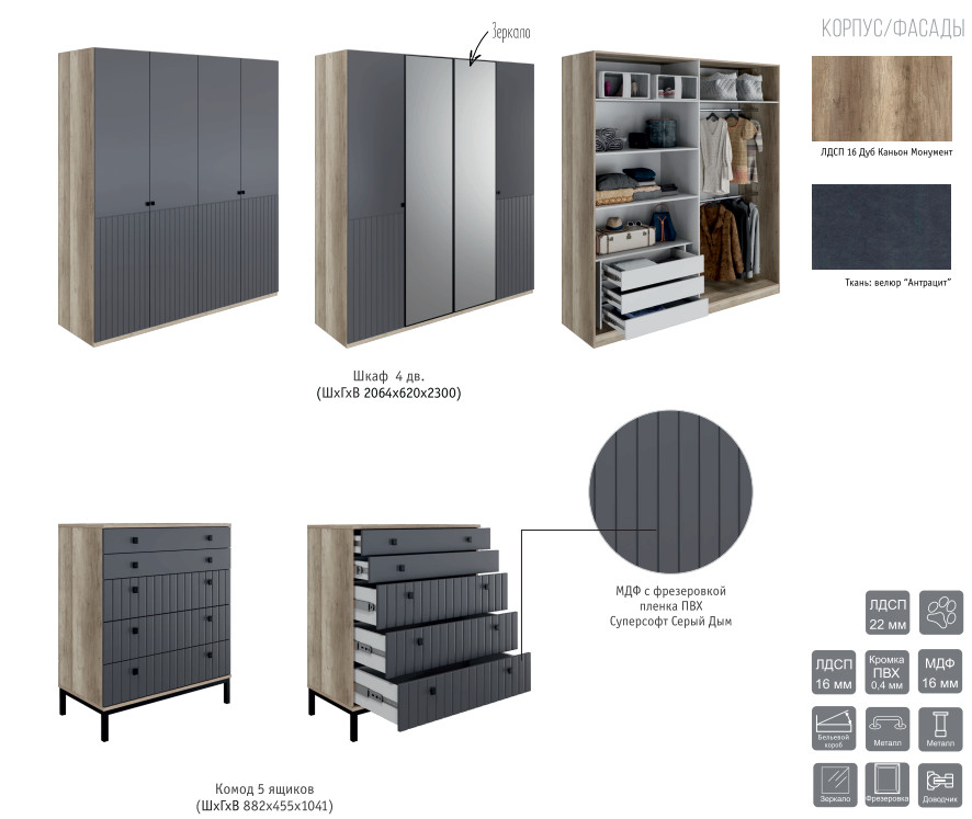 Цена за комплект: Тумба, Кровать (1600), Шкаф 4 двери (зеркало), Зеркало, Стол туалетный, Комод 5 ящиков