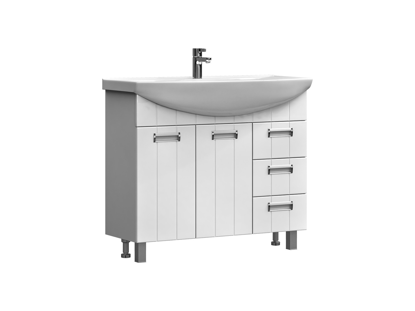 Оснащение: 2 дверцы; 3 ящика; 1 полка ЛДСП; ручка металлическая хромированная; опоры квадратные регулируемые