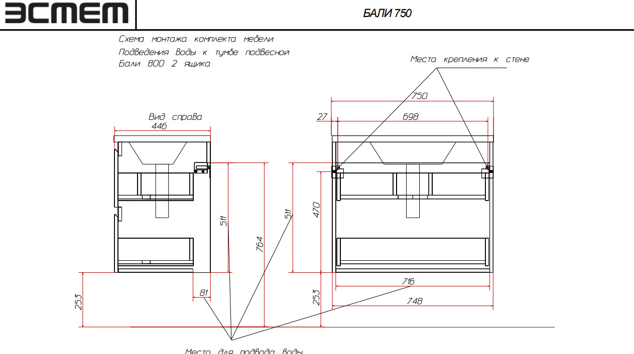 - Тумба с раковиной Bali 750 навесная 2 ящика