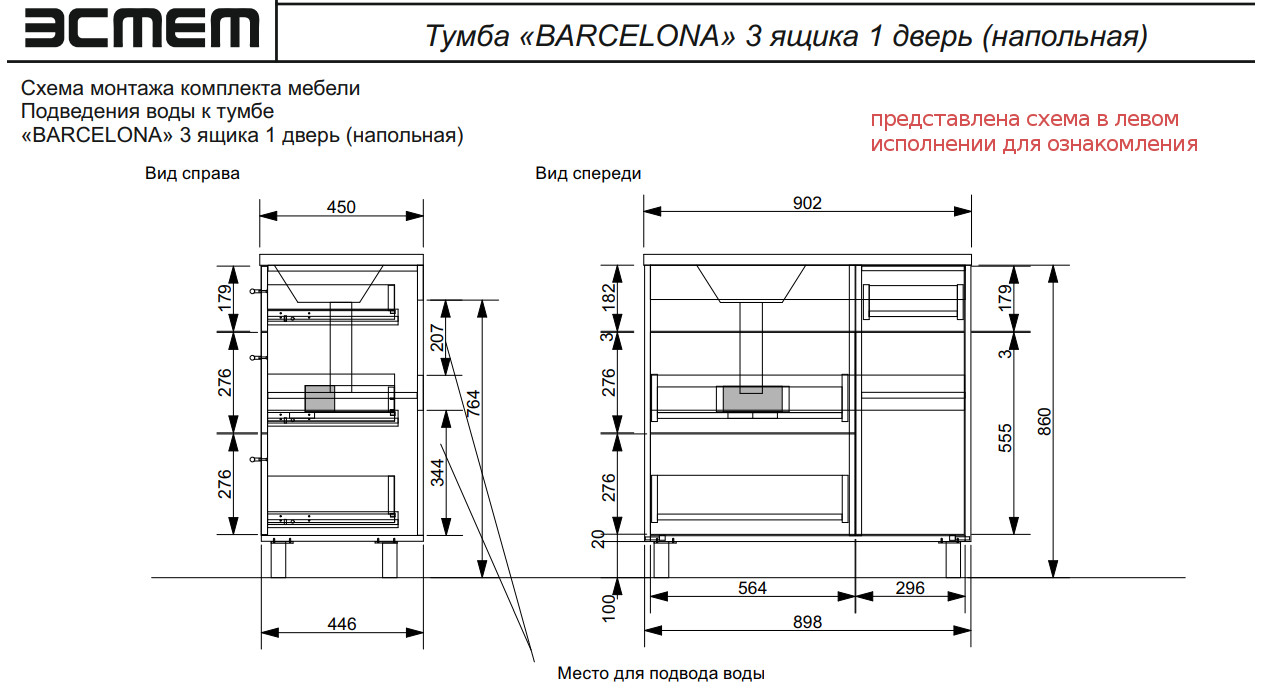 - Тумба с раковиной Barcelona 900 правосторонний напольный 3 ящика 1 дверь