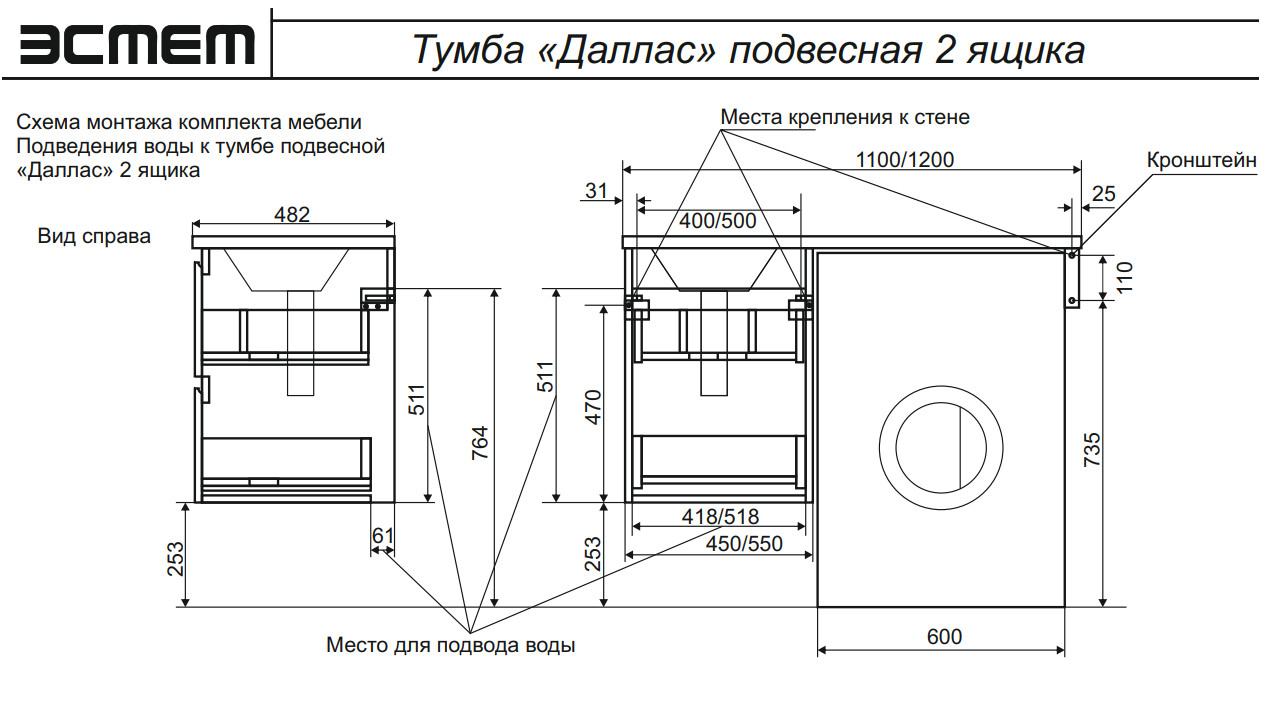- Тумба с раковиной Dallas Luxe 1200 навесная 2 ящика левая