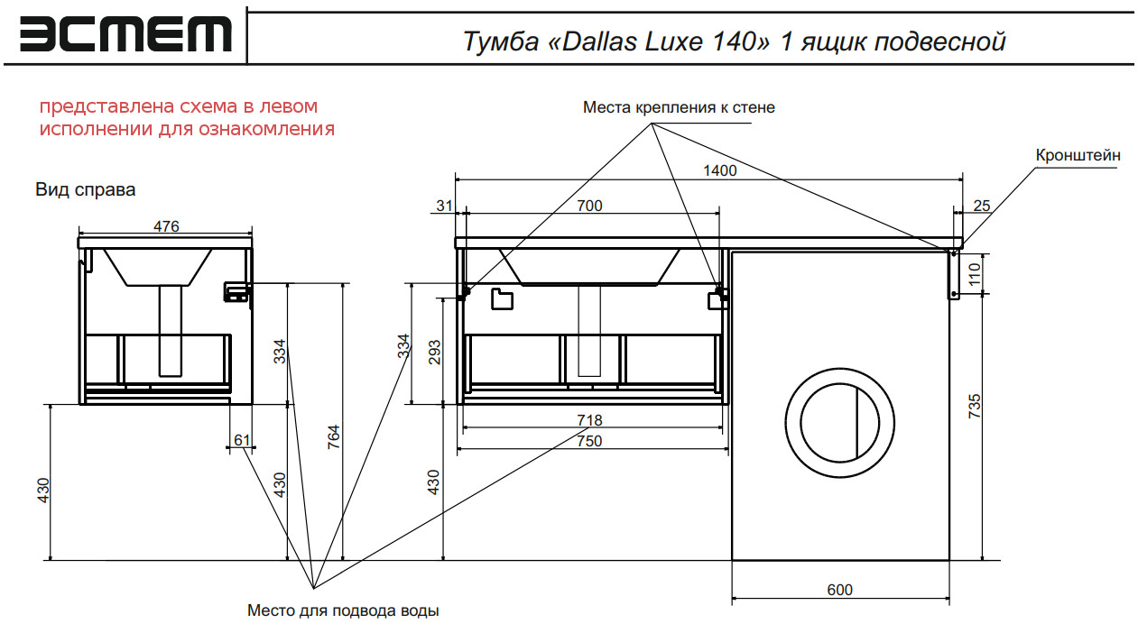 - Тумба с раковиной Dallas Luxe 1400 навесная 1 ящик правая