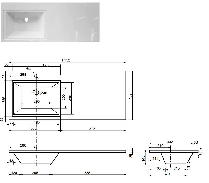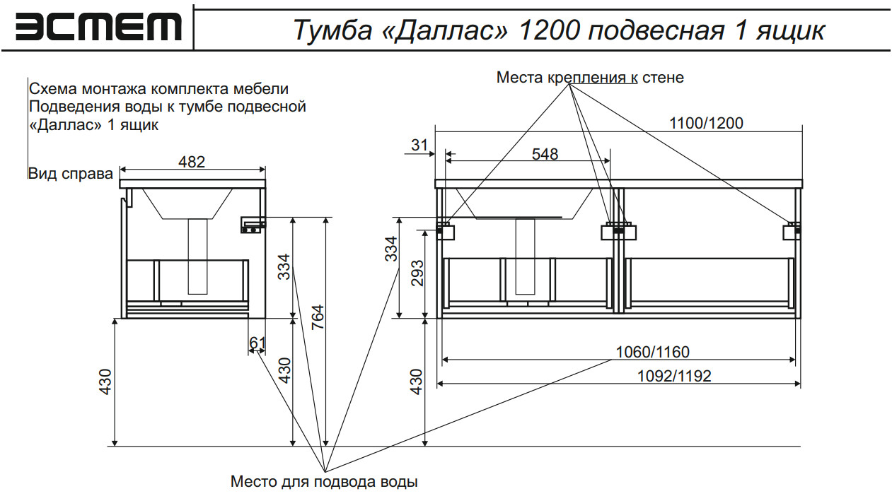 - Тумба с раковиной слева Dallas Luxe 1150 навесная 1 длинный ящик