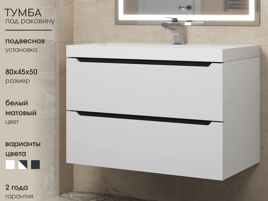 - Тумба с раковиной Uperwood Tanos матовая белая/графит 80 см
