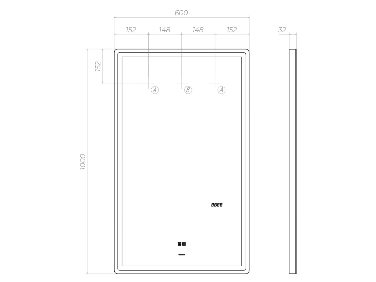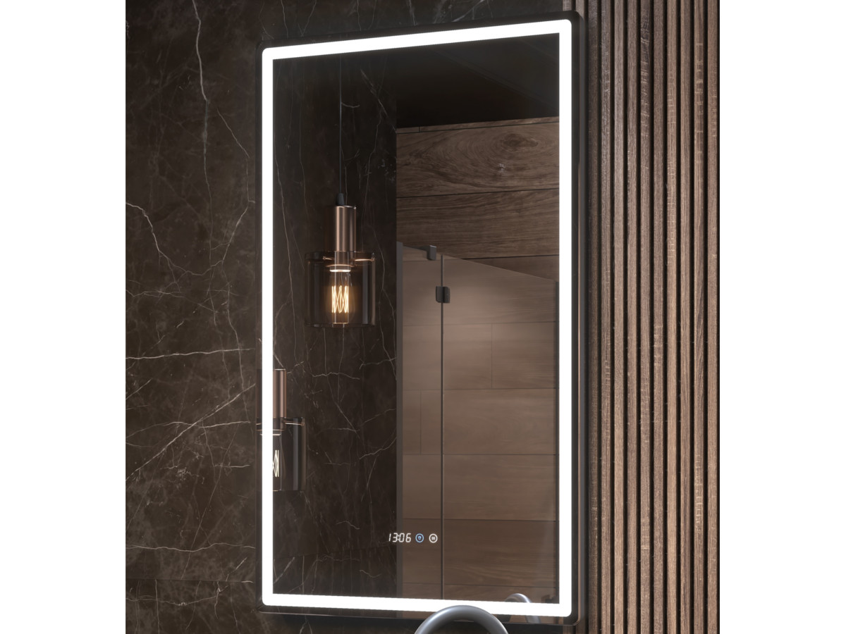 светодиодная подсветка по периметру; сенсорное управление; встроенные часы;функция антизапотевания с таймером отключения