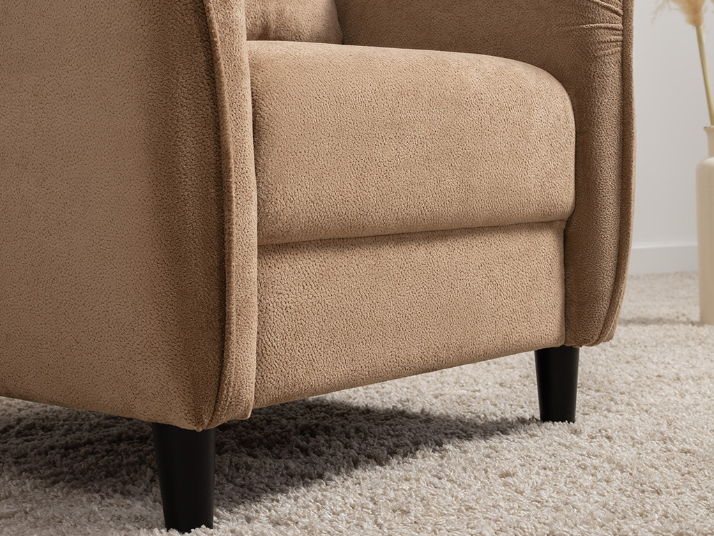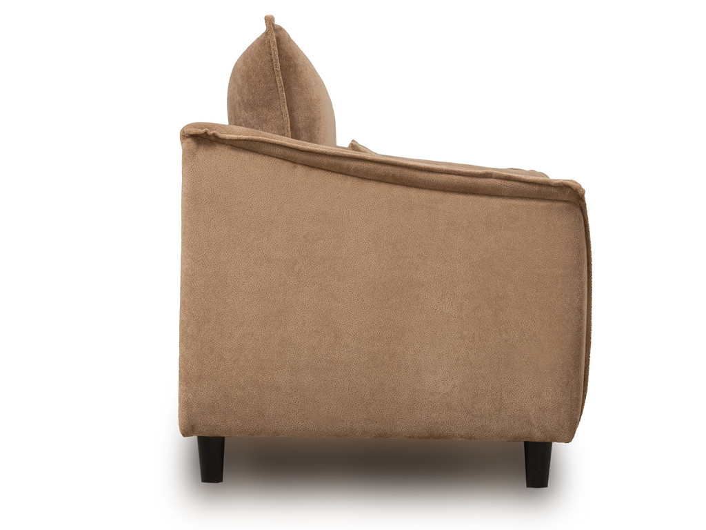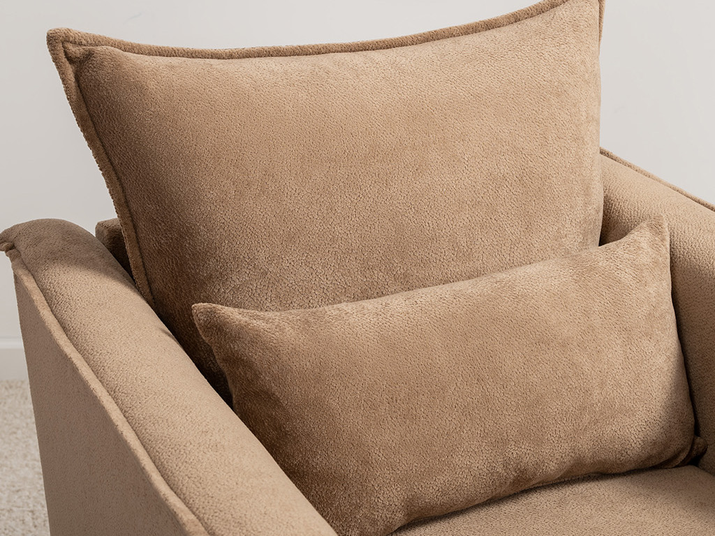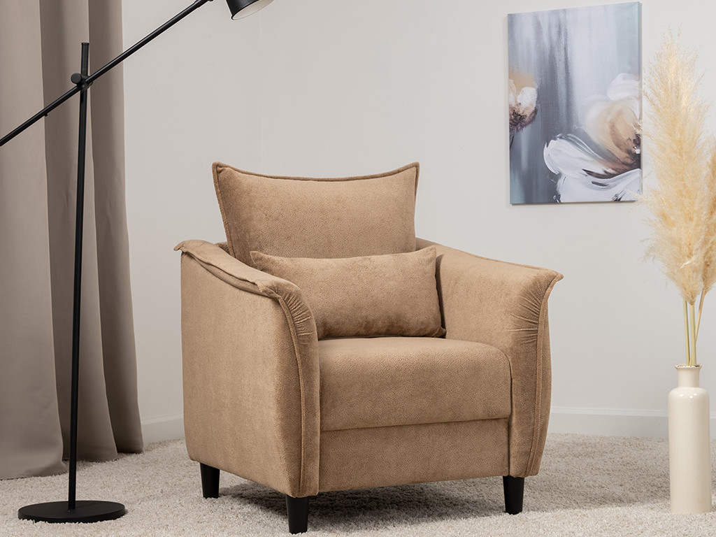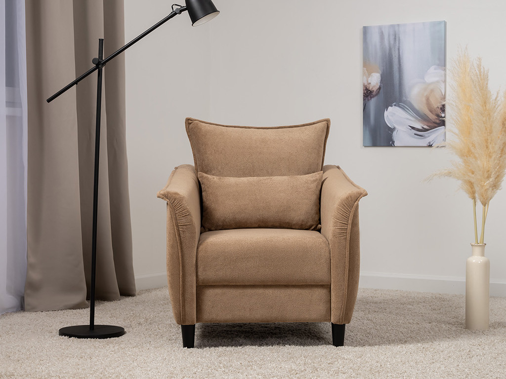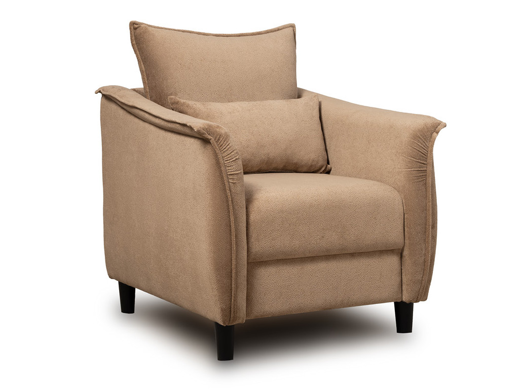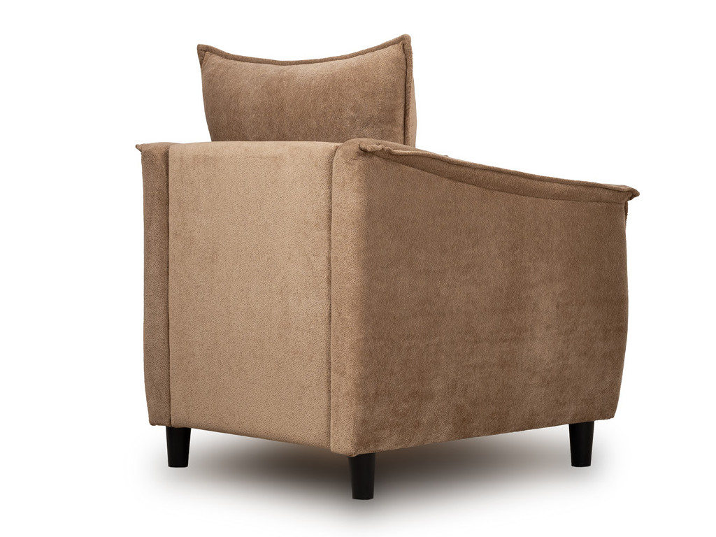 Кресло с приспинной подушкой трапецивидной формы на молнии, по трем сторонам которой проложена отделочная строчка на 1,2 см. По контуру боковин проложен декоративный кант на 1,2 см основной ткани. Кант проходит по центру передней части боковины, а по внутренней верхней части сборка.