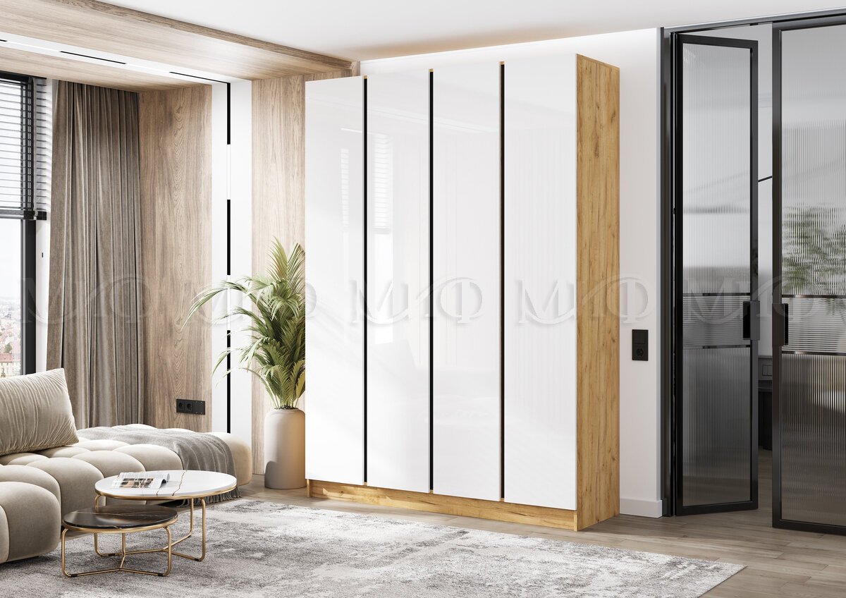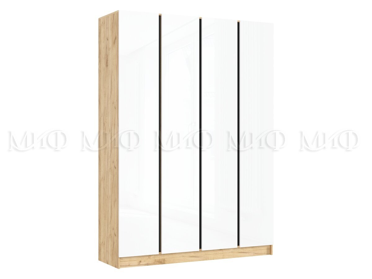 - Шкаф четырехстворчатый Келвин (1600) Белый Глянец, Дуб Крафт-вставка черная