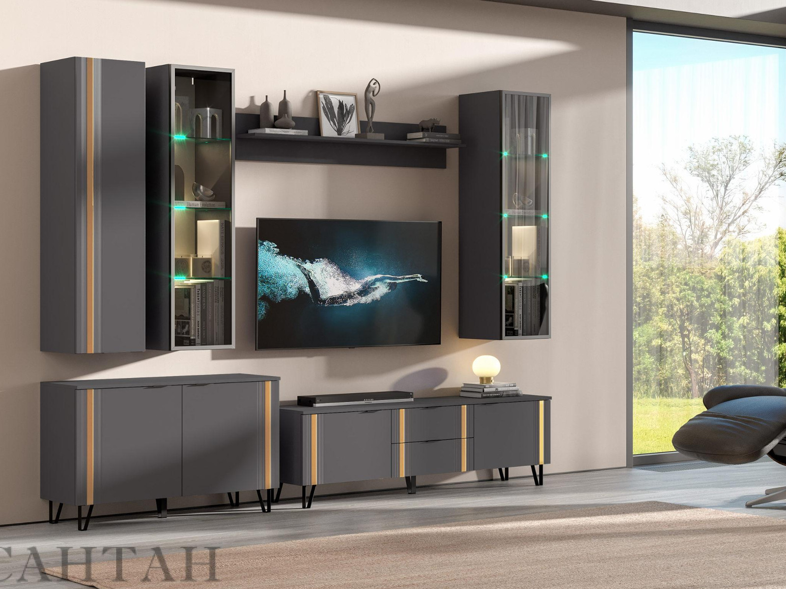- Фасады из МДФ с оригинальной фрезеровкой покрыты суперматовой пленкой с эффектом Soft Touch в цветах Графит и Milk.