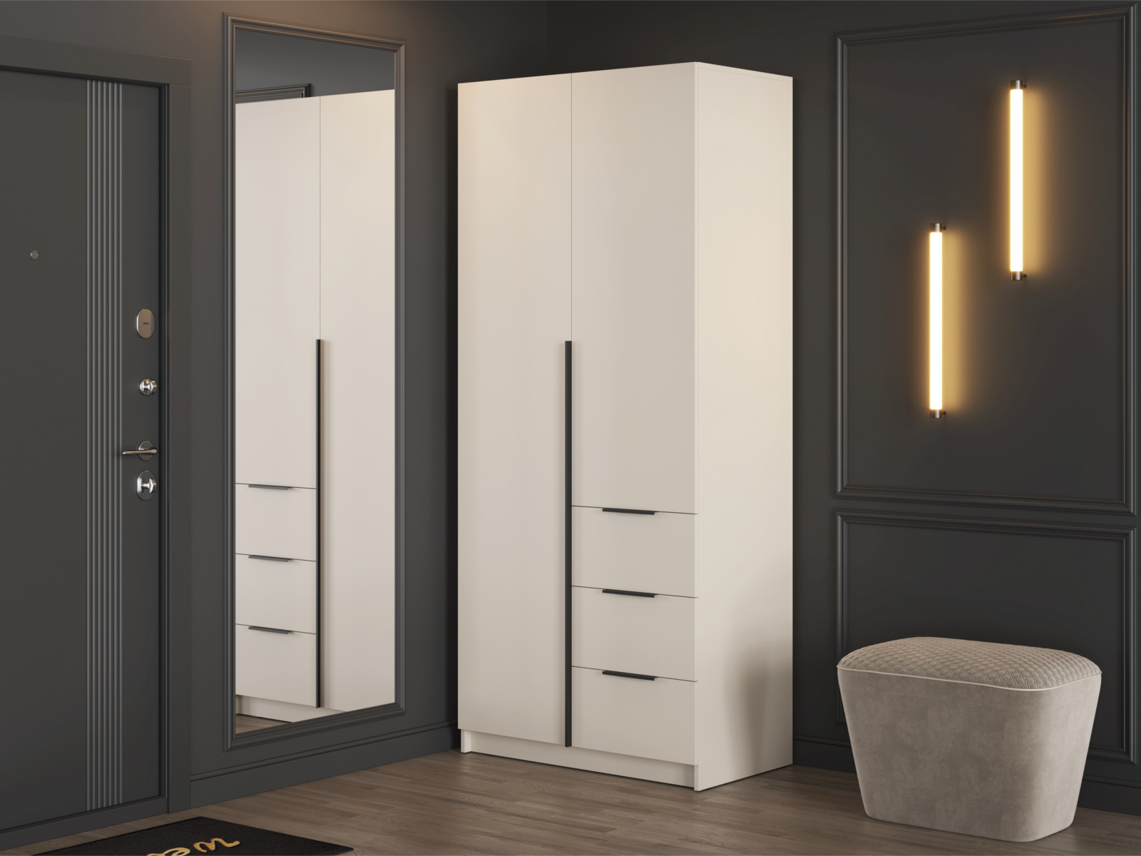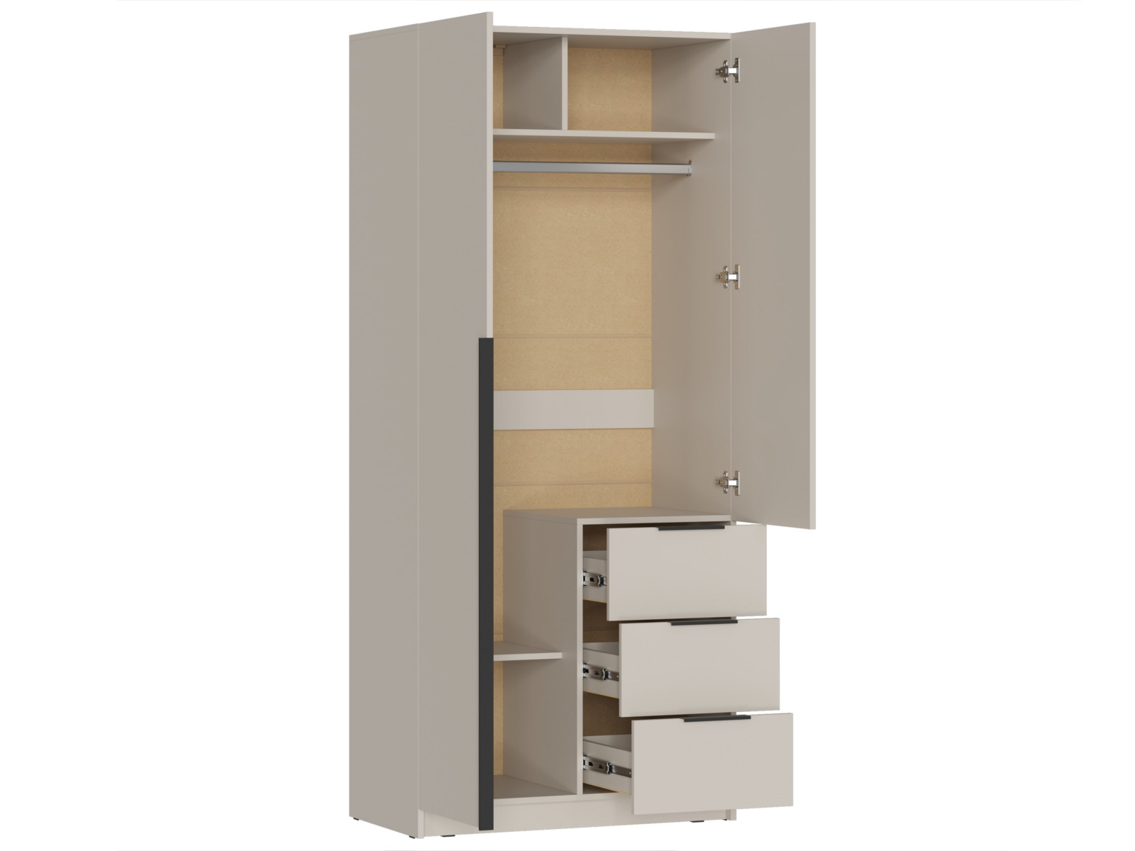 - Левая створка и фасады ящиков имеют ручку – цвет чёрный, материал – пластик.