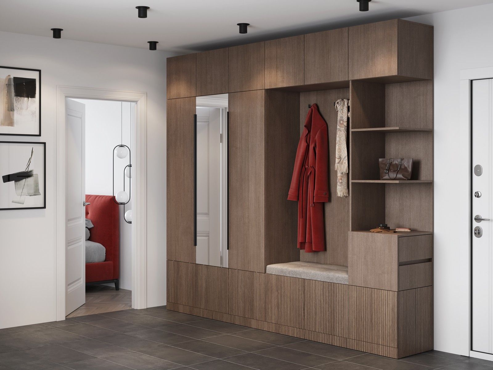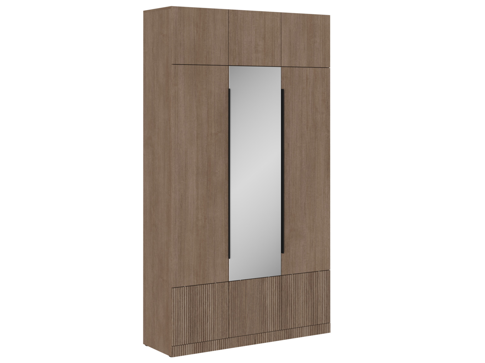 В центральной части шкафа расположена вязка для крепления к ней выдвижной вешалки. Выдвижная вешалка крепится и к верхней вязке. Нагрузка на вешалку 5 кг. Ниши с вешалками равнозначные по габаритному размеру Д.600 х В.943 х Г.426 мм.