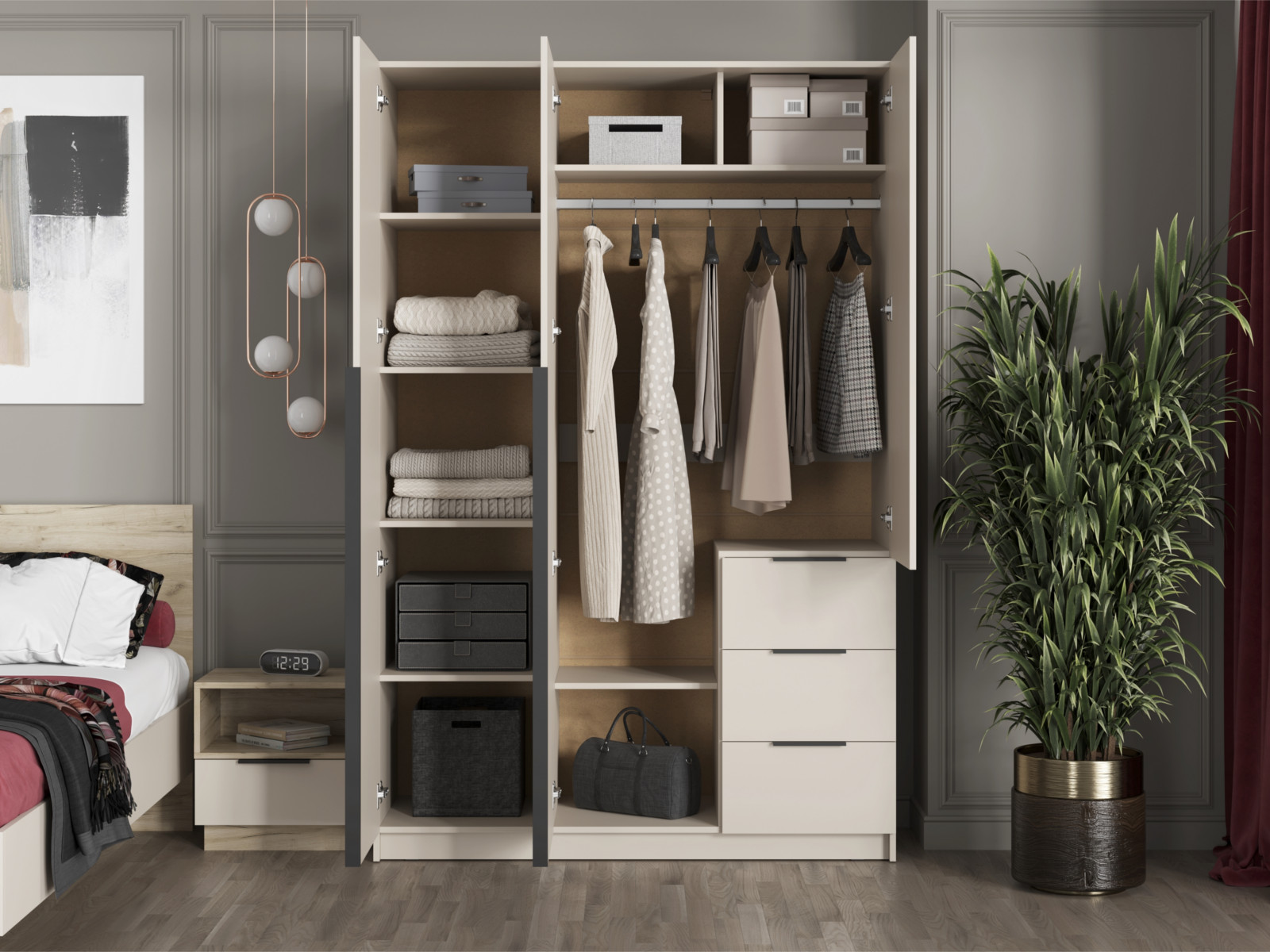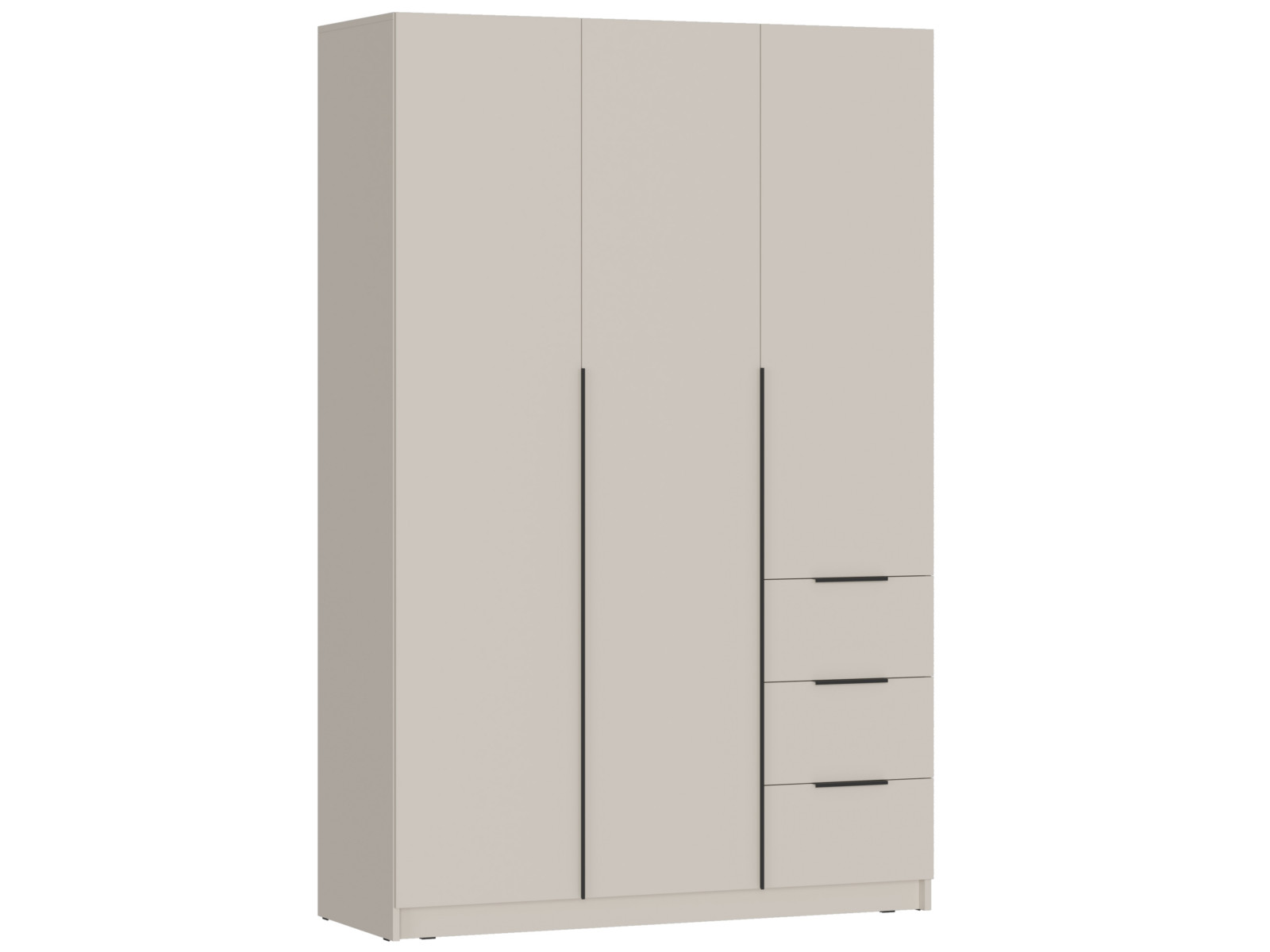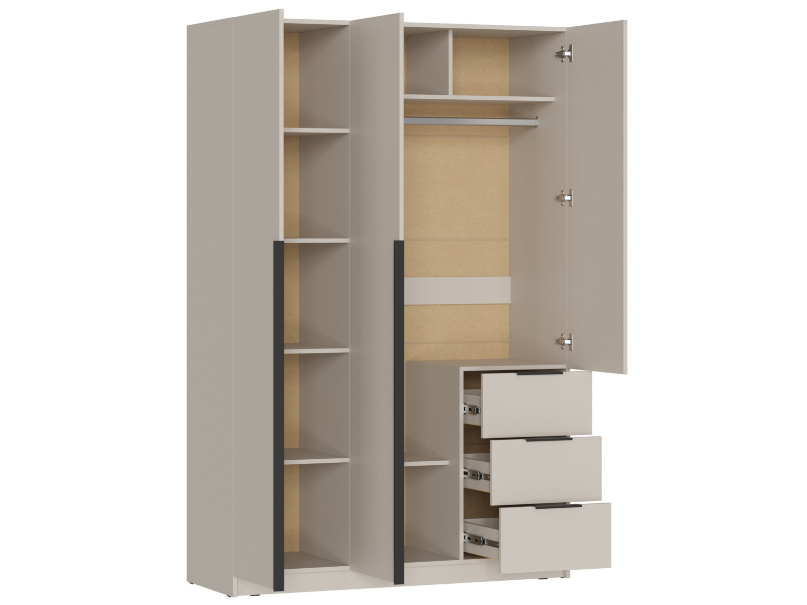 - Две левых створки и фасады ящиков имеют ручку – цвет чёрный, материал – пластик.