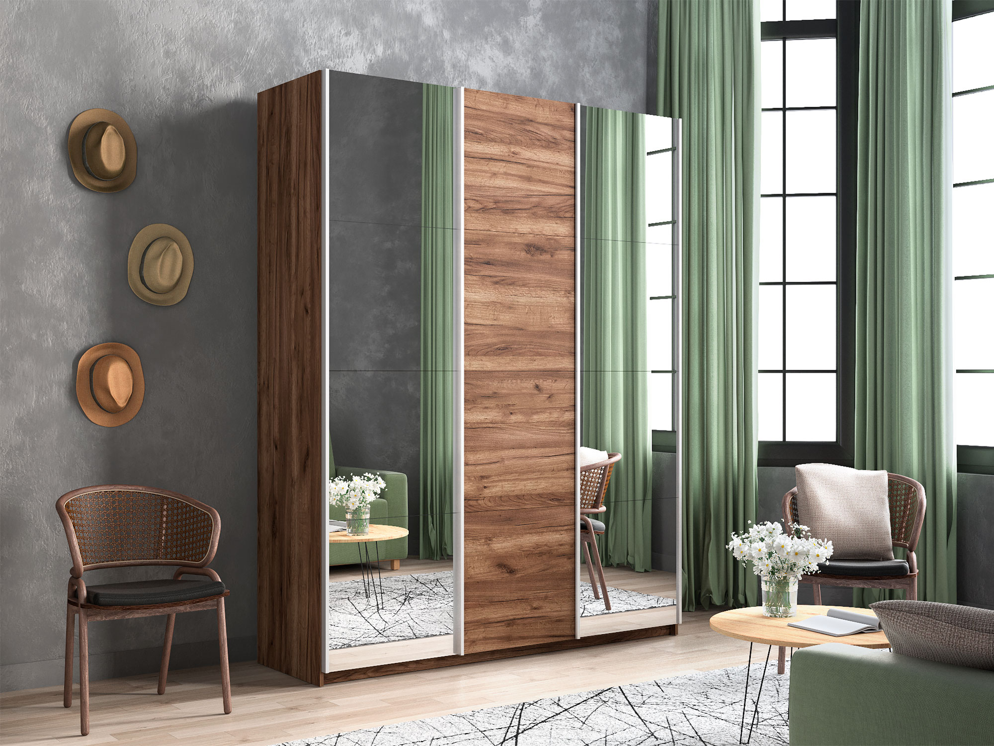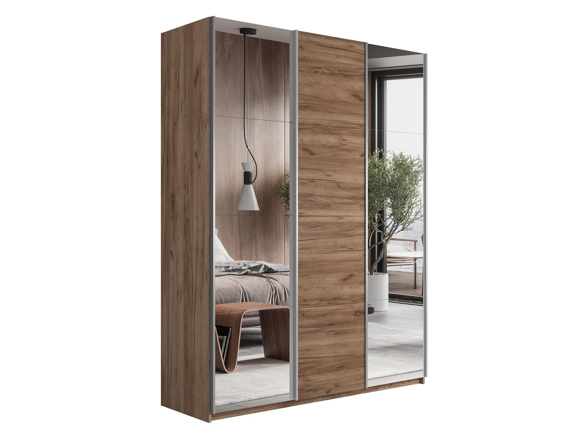 - Шкаф-купе Прайм 3-х дверный 1800 два Зеркала/ДСП Крафт табачный