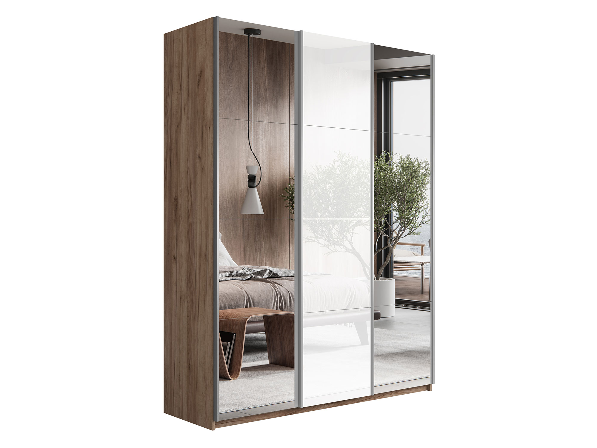 - Шкаф-купе Прайм 3-х дверный 1800 Зеркало/Стекло Белое/Зеркало Крафт табачный